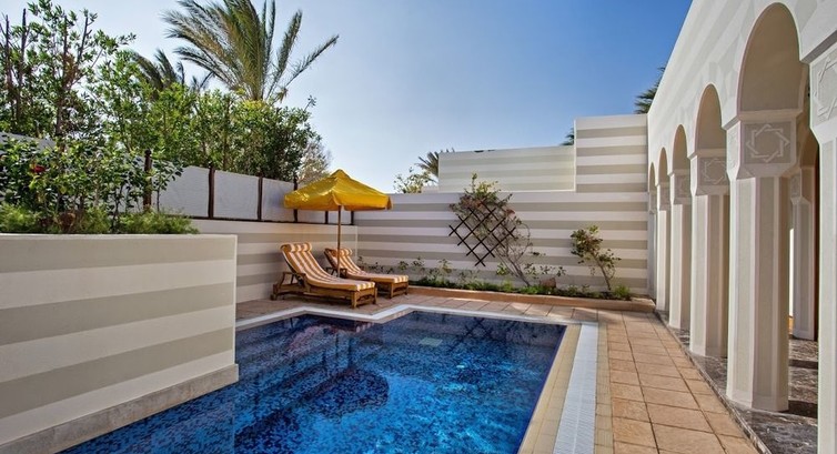 6 Royal Suite (100 кв. м, макс. 2+2 чол., Вітальня, спальня з дверима, 2 ванні кімнати, кухня, басейн з підігрівом).