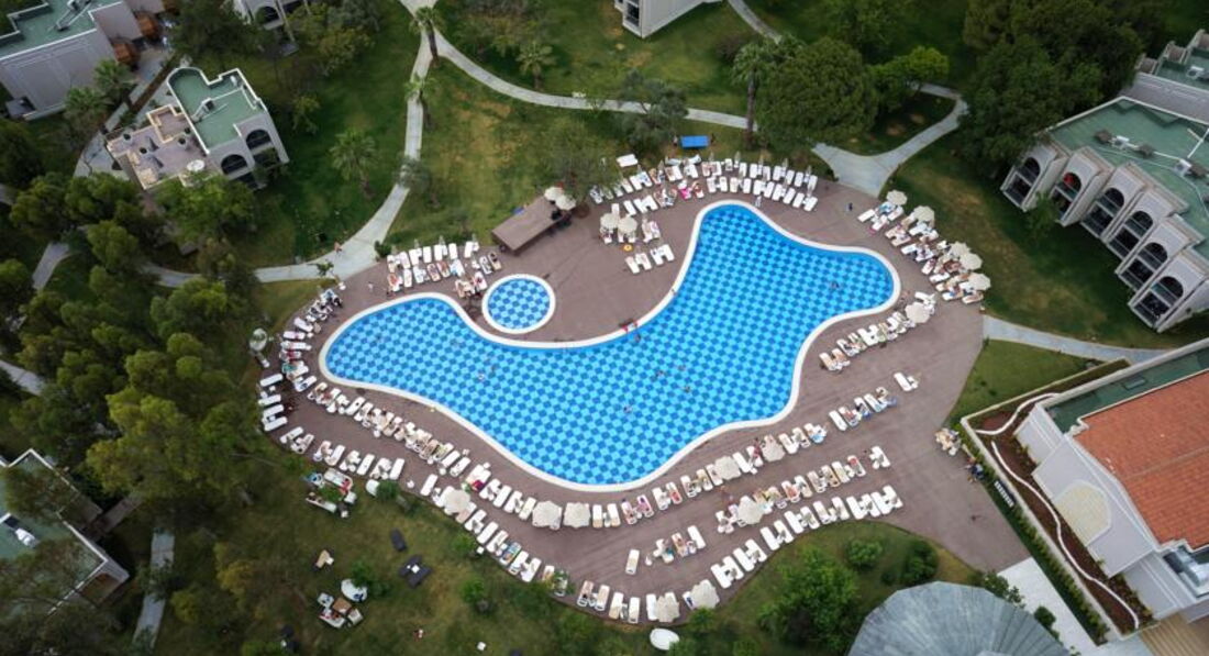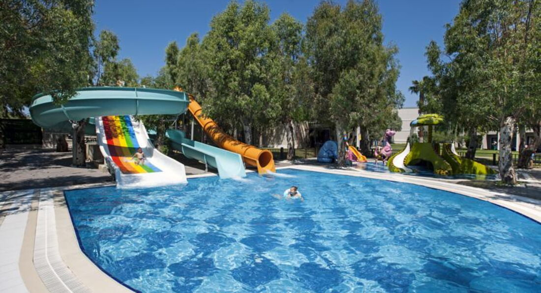 Территория отеля очень красивая, зеленая. Природа чудесная - кругом горы и зелень. На территории есть Миниклуб для деток, 3 горки и детская площадка с горками и качелями. 2 бассейна - один маленький для малышей и один глубиной от 85 до 150 см в разных концах.