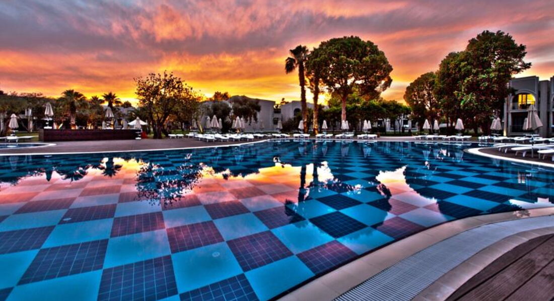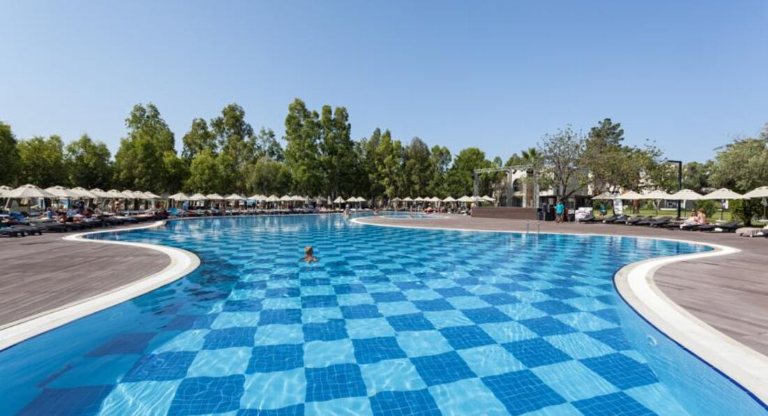 Отдыхала с ребёнком и мамой. Из недостатков: море очень мелкое, до глубины ну очень далеко, хотя если с детьми то хорошо; не большое разнообразие блюд для малыша (постоянно картошка фри и макароны для детей были - мы не едим такого; пюре 2 раза в неделю, рис, рыба, овощи на пару, каша молочная по утрам, йогурты по утрам - все чем мы питались 3 недели, вообщем с едой было напряжно для ребёнка, некоторые мамы брали с собой мультиварку и готовили сами; не совсем чистое постельное белье и полотенца - желтые пятна, дырки; ну и кроме как на территории отеля гулять с коляской не было места, за территорией просто дорога. Тем не менее все остальное отлично- территория большая и ухоженная, в номерах уборка ежедневно; аниматоры супер; лежаков достаточно. Жили в корпусе А, музыка не напрягала.