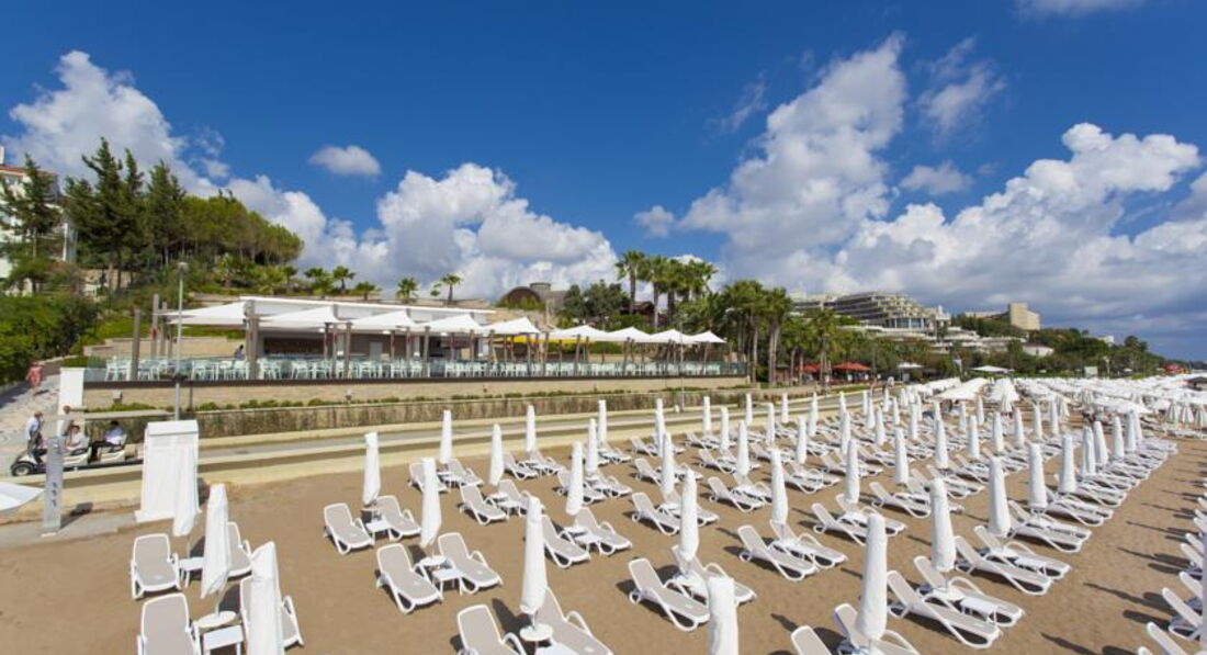 У отеля хорошо оборудованный пляж с пирсом. Вход в море плохой, каменистый. Я купалась на соседнем пляже и купаласькогда бегала утром на пляже в Сиде, чистом и пологом! И до пляжа надо дойти метро 300 может. Но это не напрягает. Волейбол на пляже есть. Также ресторанчик, в котором можно выпить и покушать, очень уютный!