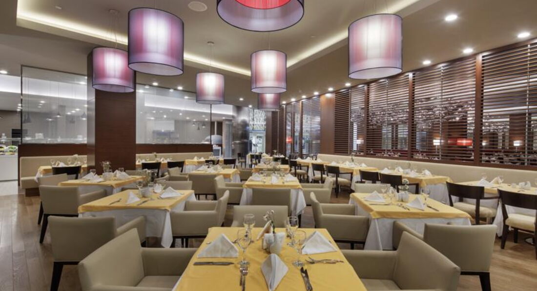 По ресторану-еда разнообразная.Все понравилось.Я любитель мяса(рыбу не люблю-но рыбы было много разной),мяса много и в разных видах приготовления.Есть и без специй.И со специями.Есть диетическое меню-но почему-то там лежит картофель фри и жареные котлеты,жареные сырные палочки(так что это минус -диетического меню толком не было).Ребенку еду там найти сложно-но можно.Моей 2 года и ела она по-немногу рис,лапшу,супы с хлебом,помидоры,огурцы,яблоки,арбузы.Мясо там не ела-специй много в нем для ребенка.По утрам ела оладушки с йогуртом.Голодным ребенок не останется-но мой совет -брать побольше детских баночек с едой с собой(у нас было мало,в магазинах рядом с отелем не нашли).Взрослым отдыхающим еды очень много и на любой вкус.Конечно,не ждите,что будет все как в ресторанах(Обычный средний шведский стол).Описывать подробно не буду-люди уже описывали в предыдущих отзывах.Из еды что не понравилось мне-мало разнообразия фруктови они все зеленые.Ни разу не было клубники и черешни(хотя с нами в автобусе ехали люди с других отелей дешевле уровнем,там давали и черешню, и клубнику).Абрикосы были редко и сливы(очень зеленые и кислые).Апельсины тоже кислые.Грейпфрукты сильно горькие.Дыни и арбузы не очень-если успеешь выбрать кусочек из серединки(а людей стоит много и все хотят хороший кусочек)-то он будет сладкий.А так все зеленое.Яблоки тоже одного вида то зеленые(не очень),то красные(они получше).По утрам несколько раз было полное отсутствие фруктов-это минус.И пару раз по вечерам тем,кто приходил к концу ужина,не хватало арбузов.Много всяких пирожных,думаю детям постарше понравились бы.Я люблю сладкое-но у них все пирожные хоть и красиво выглядят,а на вкус не очень(на любителя).Очередей практически не было.Но в конце отдыха стало много народу и появились очереди.(небольшие,терпимые)Помимо основного ресторана есть бары.Бар на пляже неплохой,но мне не понравилось,что он рано закрывается,в других отелях до 12 ночи работают.(просто очень хотелось вечерами посидеть у моря,как в других отелях на набережной)В самом отеле тоже несколько баров.Коктейли типичные для всей Турции(хоть алкогольные,хоть безалкогольные).Мне очень понравились безалкогольные.Вино хоть в барах,хоть в ресторанах-не понравилось.Сильно уж оно отдает алкоголем и похоже на наши дешевые вина из коробок(хотя официанты при вас открывают бутылки).Белое и красное вино ужасное,розовое терпимо,но тоже нисшего сорта.Пиво пробовала один раз-самое дешевое российское жигулевское-и то лучше.Единственное,что понравилось-виски.Более менее похоже на нормальное.(Я не любитель алкоголя,но на отдыхе немного пробую ради интереса).Айран очень люблю-но он в ресторане в основном был очень редко-всего 2 раза за 10 дней.Часто он был в баре на пляже(но тоже его быстро разбирали)Про ресторан допишу-официанты относятся ко всем одинаково-нет разделения на русских и немцев и т.д.Я чаевых не давала-а официанты относились одинаково хорошо.Конечно,когда народу очень много,приходилось долго ждать чтоб налили вина или многие сами наливали.Но так в целом-официанты быстро все меняют,убирают грязную посуду.Детям улыбаются.В столовой есть детская зона(стульчики,столики,качалки)-моей дочке очень там нравилось.Не хотела уходить.