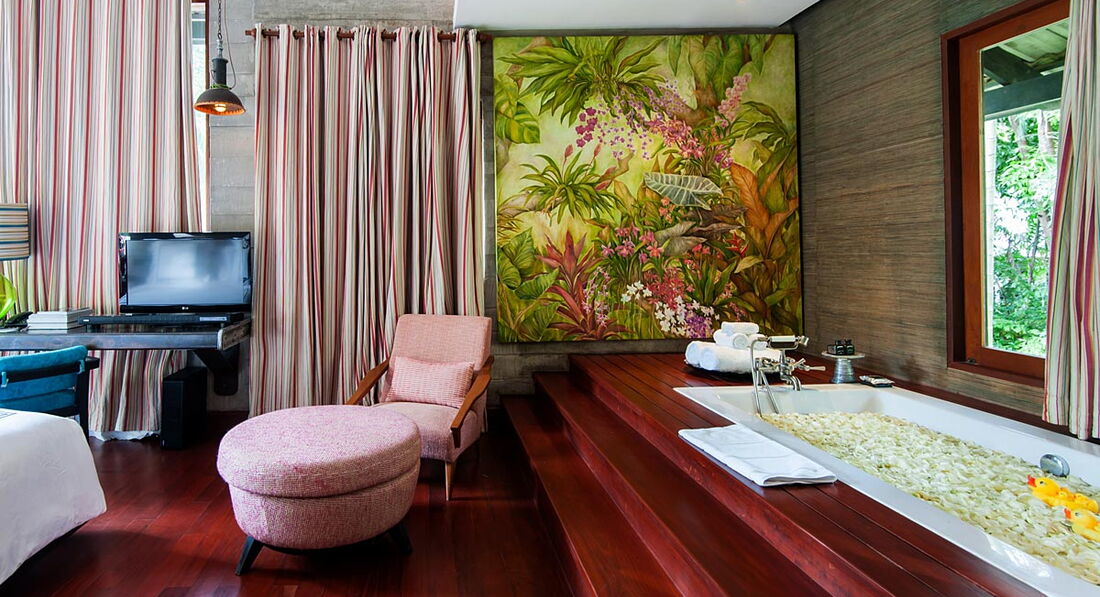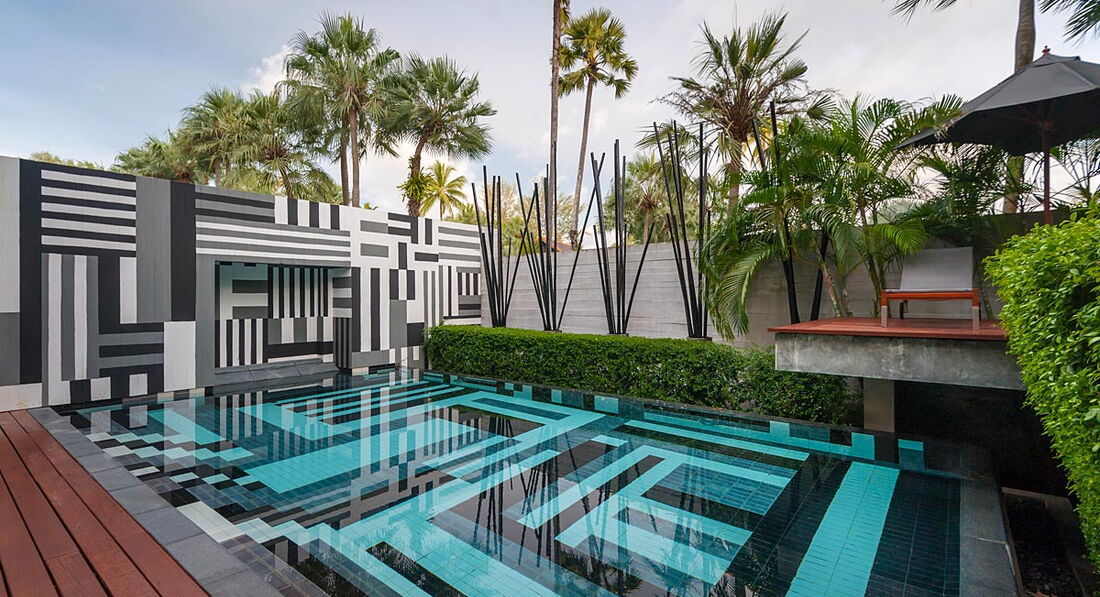 У дизайні готелю втілено неповторне поєднання постмодерного мистецтва та традицій побуту андаманського узбережжя Таїланду.