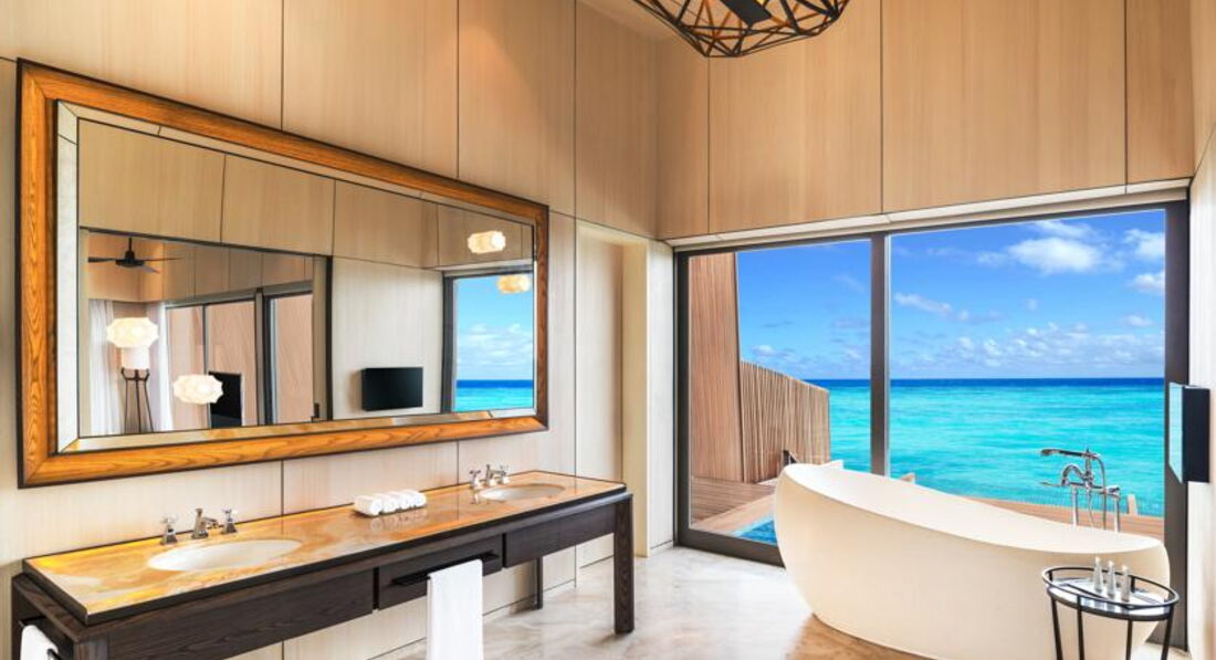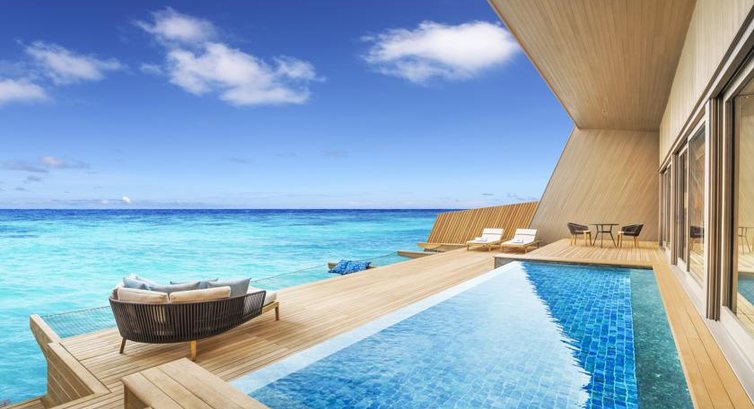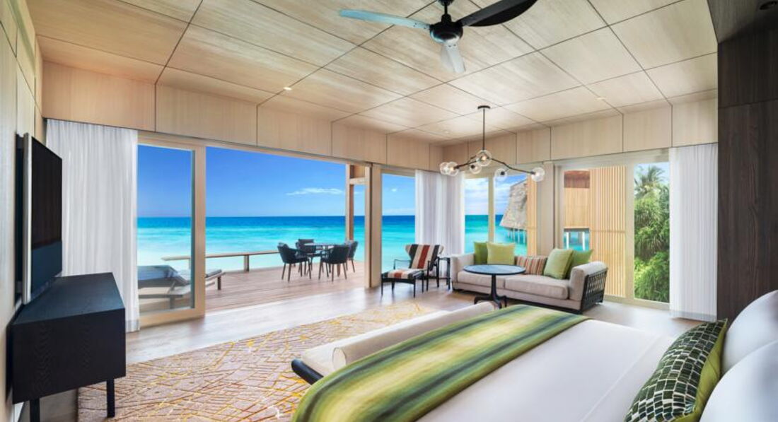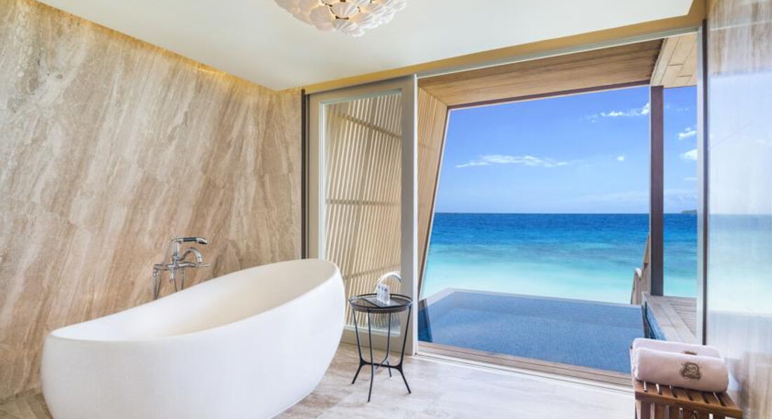 8 Overwater St. Regis Suite with Pool (282 м2, макс. 3 або 2+1 чол.). Водні вілли з видом на океан та прямим спуском у воду. Спальня з ліжком king-size, обідня зона, ванна кімната з двома раковинами, ванною та зливовим душем, зона відпочинку. Тераса з приватним басейном (16 м2) та шезлонгами.