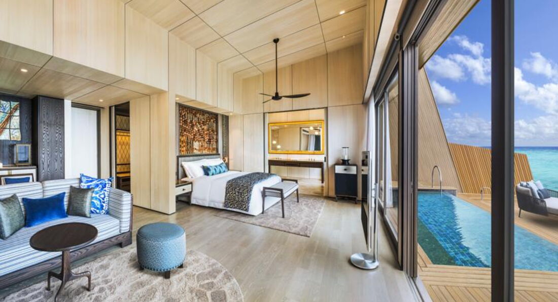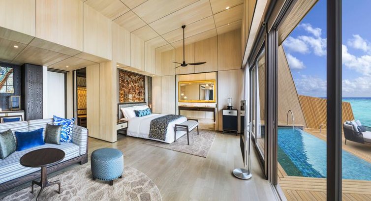 21 One-Bedroom Overwater Villa with Pool (182 м2, макс. 3 або 2+1 чол.). Водні вілли з видом на океан. Спальня з ліжком king-size, ванна кімната з двома раковинами, ванною та зливовим душем, тераса з приватним басейном (15 м2), гамаками та шезлонгами. Прямий спуск у воду.