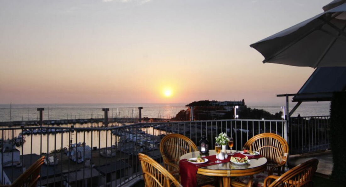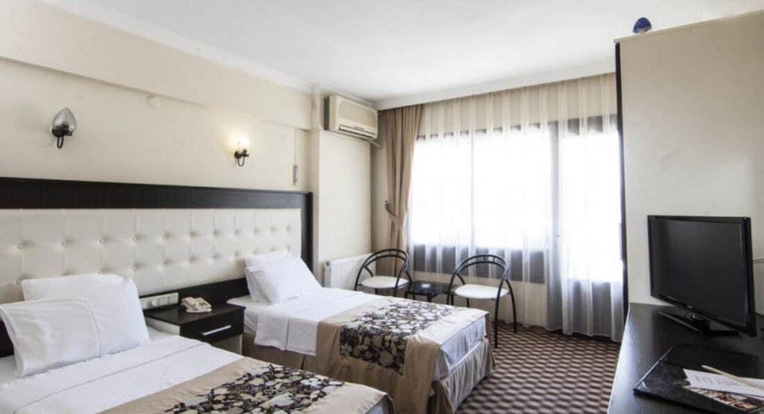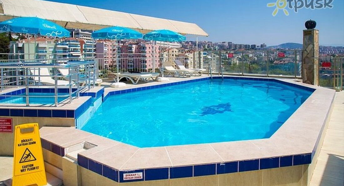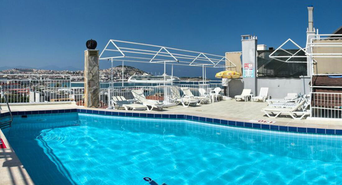 Отдыхали в этом отеле в августе 2013. Ехали в Турцию в первый раз, и как оказалось первый блин комом. Ехали семьей-мы с мужем и ребенок 4 года. Отель конечно никак не 4звезды, а скорее три. Поселили нас в номер с тремя отдельными кроватями, пришлось две кровати сдвигать вместе, но это как бы не самое главное, что нам не понравилось. Начну с моря, ради которого мы в принципе и ехали в Турцию отдыхать. Собственного пляжа у отеля нет.Море от отеля совсем близко, но из-за того что там порт, идти до пляжа прилично и лежаки с зонтами там платные, а сам пляж...ооочень грязный. Соотношение мусора(главным образом бычков от сигарет) и песка 50 на 50. За все время отдыха мы так и не рискнули с ребенком побыть на пляже и искупаться в море. Только вечером, прогуливаясь по городу, пару раз помочили ноги в воде...В связи с этим нам пришлось довольствоваться бассейном, и ребенок в принципе был доволен. Бассейнов у отеля два-один на крыше, а второй через дорогу. На крыше бассейн очень маленький и места там тоже мало.Второй бассейн побольше, но там купаются и местные жители. Питание в отеле однообразное, завтраки вообще однотипные изо дня в день, обеды у ужины тоже практически каждый день одинаковые, меняются только лишь горячие блюда. Мяса там мало, в основном курица, которую кладут тебе в тарелку по одному кусочку. Десерты там практически отсутствуют, были только пудинги и что -то вроде печенюшек. И все!!!Из фруктов были-дыня, арбуз(каждый день), персики, сливы. виноград, яблоко, апельсины. Анимации детской там вообще нет!!! Единственным развлечением была горка, рядом с отелем, и только по вечерам. потому что днем там кататься невозможно-очень горячо...Для взрослых была какая-то анимация по вечерам в ресторане. Мы как-то пришли туда , а мест за столиками не было. Больше и не ходили. Кстати, вид из окна ресторана шикарный-море, порт, яхты, лайнеры...И это один из плюсов ресторана. В отеле своя баня, бильярд, настольный теннис.Персонал в ресторане молодой, приветливый. Русскоговорящего персонала там нет, но говорят по английски.Хозяин отеля приветливый и дружелюбный, дарил два раза подарки ребенку, спрашивал как нам отдыхается, а по отъезду приглашал нас в следующем году опять посетить его отель...Отель находится в центре города, прогуляться по магазинам, по рынку, посетить кафешки все это предоставляется возможным и это конечно тоже плюс!!!!В итоге сделали вывод, что отель для людей старшего возраста, ближе к пенсионному, для которых важны тишина и спокойствие. И кстати, таких людей(бабушек и дедушек)в отеле было достаточно.В итоге, в этот отель больше не поедем.