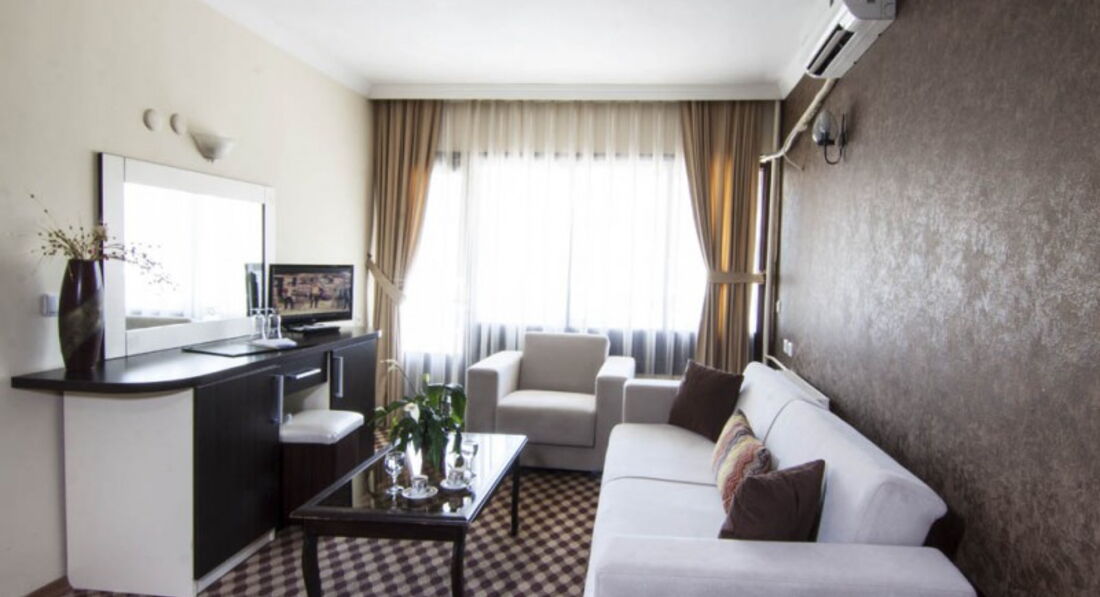 Отдыхали в поселке под Кушадасами, но нам хотелось побывать непосредственно в центре Кушадас и мы провели 2 дня в данном отеле))) Отель новый, 4 звезды - по европейским меркам, а по турецким - все 5+++. Расположен недалеко от моря и вблизи набережной Ататюрка, где есть все развлечения. Ресепшен и номера - все новое. Нас заселили в номер просто отличный, с балконом (вид, конечно не очень, но видно море и набережную), в номере все новое, сантехника тоже. телек и кондер исправно работали. В отеле есть 2 бассейна, один напротив отеля ,через дорогу (там не были), а другой на самом верхнем этаже ,под открытым небом))это нечто))что то вроде смотровой площадки)) там же на вернем этаже, ресторан. Еда очень вкусная. Хотели бы еще раз там отдохнуть)))