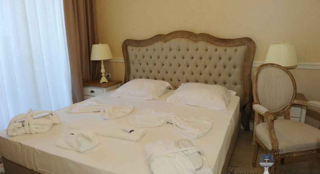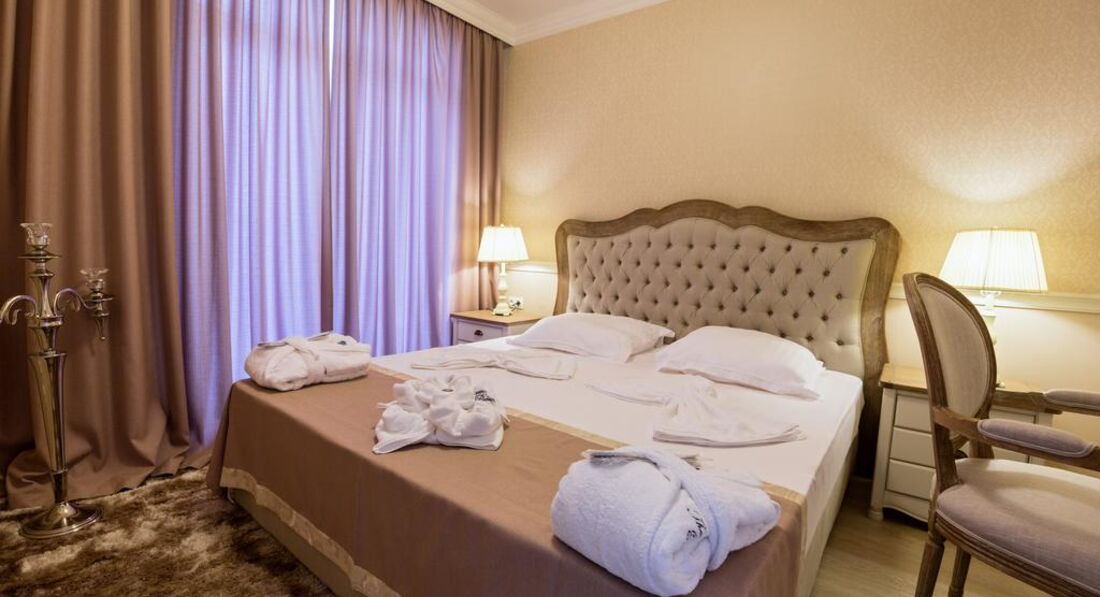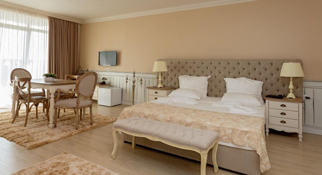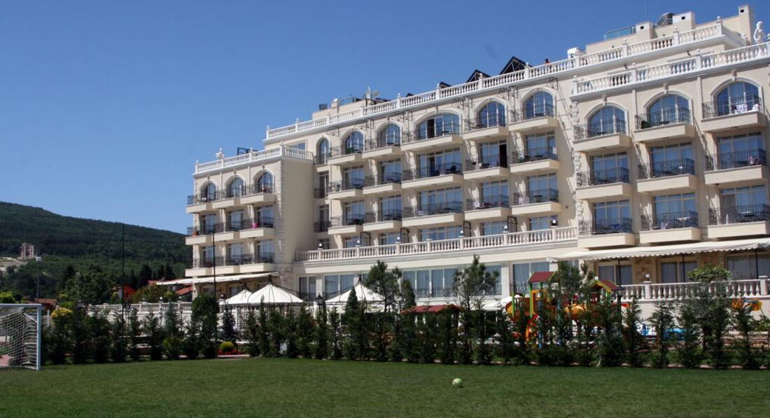 Отдыхали в этом отеле семьей с двумя детьми в августе 2016 года, все по порядку номера как на фото большие,просторные у нас были апартаменты, но уборка в номерах это тихий ужас, пришлось взять самой тряпку и вымыть все полы чтобы ребенок двух лет надышался этой пылью, отель построен в римском стиле много всяких статуй, территория облагорожена, но она такая маленькая , словно территория загородного дома, есть детская площадка, тоже маленькая, детям там заняться вообще не чем, есть анимация один раз в неделю 30 минут и все, этот отель вообще не подходит для отдыха с детьми, только для пенсионеров и так если на пару дней приехать отдохнуть порелаксировать. Питание!!! я прочитала очень много отзывов про питание, но убедилась на себе я не нашла там настолько достойного питания как его описывали, утром вы будете думать чем накормить ребенка, каша один вид все 15 дней нашего отдыха овсянка залитая горячим молоком,непроваренная, яичница уже выложенная пожаренная и остывшая,жаренный бекон и сосиски и это все!!!Обед два вида супа один из тушенки второй овощной, горячее как в советские времена подходишь к раздаче и тебе накладывают, для пяти звезд это какое то новшество,свежевыжатых соков нет, фрукты были персики , виноград и прошлогодние яблоки, а еще арбузы!!!Каждый раз стоишь на обед и думаешь чем накормить ребенка, потом идешь к раздаче и практически выпрашиваешь картофельное пюре,хорошо хоть там повар отзывчивый мужчина, а когда на раздаче стоит женщина у нее такое выражение лица "типа понаехали-надоели" и "еще что то хотят".Отель в целом неплохой но не для детей, его концепция после 16 лет, до моря минут 10 пешком, по неустроенной территории, у отеля есть собственные места на пляже, но пляж грязный, за территорией отеля вообще делать нечего помойка одна сплошная и разруха. Спа центр есть ,но платный, бесплатно только сауны хорошо если будут прогретые, соляная комната вечно не разогретая и травяная сауна остальное все платно!Я не видала чтобы бассейны вымывали , сразу вам скажу в этот отель приходят все кому не лень, платят 25 левов и могут проводить целый день в спа центре, нам повезло у нас вообще какие то не знаю какой национальности прямо в во всей своей верхней одежде залезли в бассейн и никто им ничего не мог сказать, территория отеля не охраняется и не закрыта,поэтому повнимательней с детьми, все кто идут с общественного пляжа проходят через этот отель, в ресторане посуду моют очень плохо, у нас дети сразу же подхватили в этом отеле ротавирус инфекцию, я думала мы там одни такие, а нет оказывается там блюет весь отель, если собственники отеля не начнут этим отелем вплотную заниматься, через год он вообще придет в упадническое состояние!!!!Этот отель по сервису,качеству предоставляемых услуг, по питанию,по размещению, по обслуживанию и по месторасположению честно могу сказать еле дотягивает до 4 звезд,НЕ СОВЕТУЮ!!!!!!