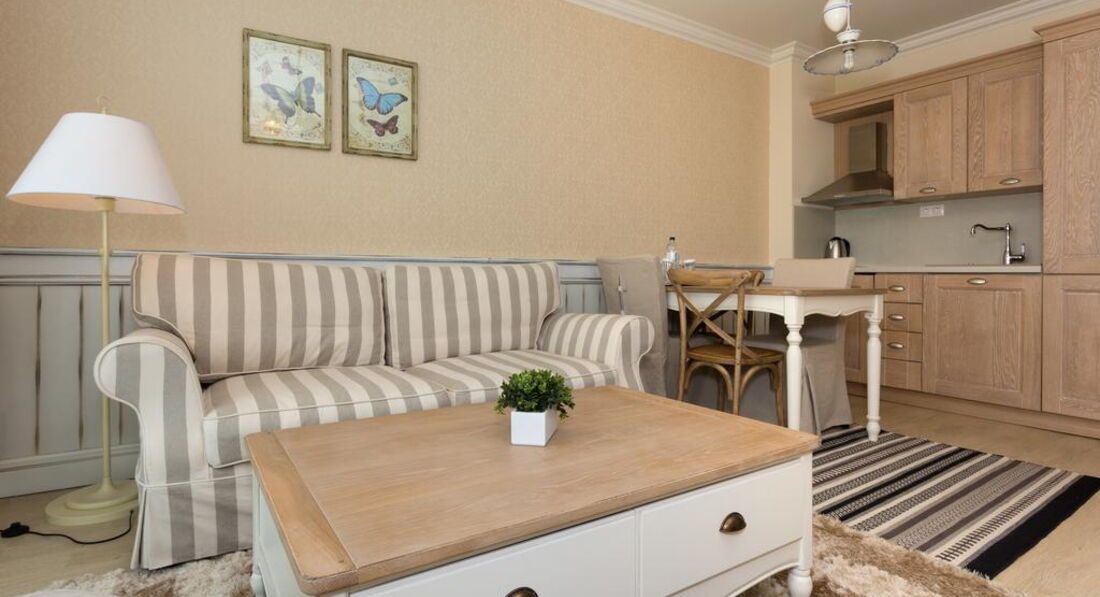 Standard Apartment – спальня з двоспальним ліжком та вітальня з розкладним диваном, обіднім столом та кухонним блоком (плита, витяжка, холодильник, електрочайник), міжкімнатні двері, ванна кімната з ванною та душовою кабіною, макс. 3 дор.+1 дит., 47 м2,