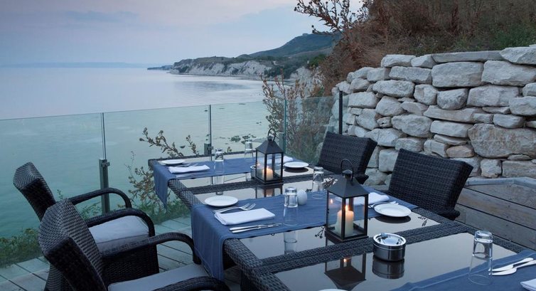 Потрясающие виды на ухоженную территорию отеля, лазурное море в обрамлении известковых скал.