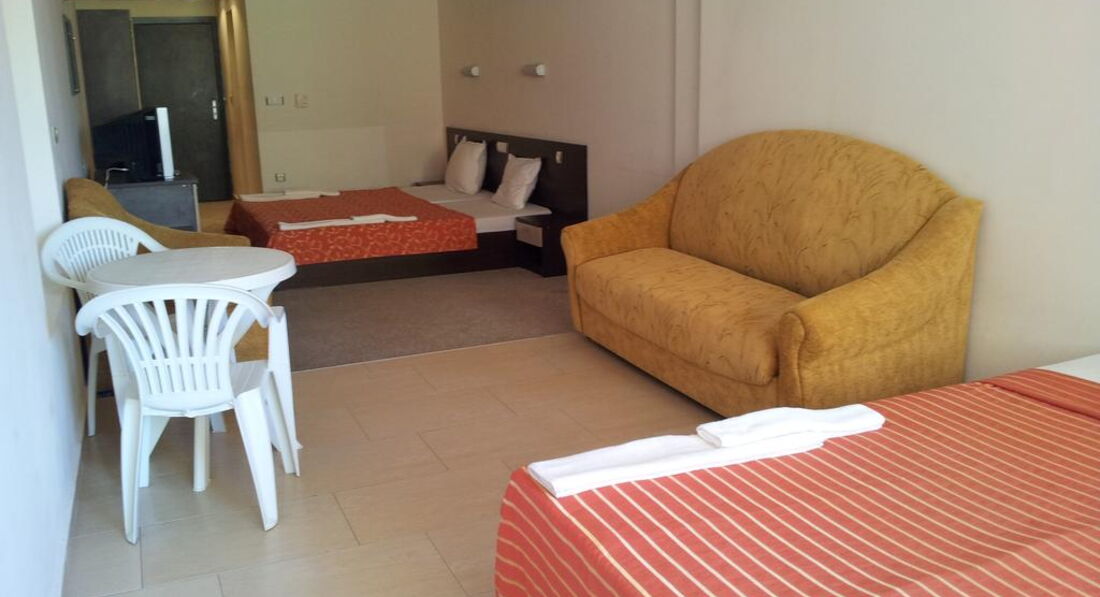 Кімнати: ми розміщувалися в кімнаті утрьох (брали додаткове ліжко). Кімната досить простора, є холодильник, кондиціонер, телевізор. Прибирання і заміна білизни нас влаштовували. Був випадок, коли не прибрали, але після дзвінка на рецепшн усе було моментально виправлено! Здивувало те, що більшість персоналу - молодь, і за свою роботу вони тримаються, тому завжди привітні. Не сподобалось те, що "оренда" праски платна (1 чи 2 євро, уже не пам"ятаю). В готелі є басейн, бар і тераси для відпочинку.