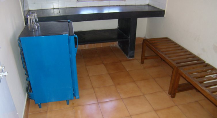 - есть "кухня". Но только номинально. На кухне раковина с одним краном и убитый в хлам холодильничек, который вообще не выключался, а весь объём морозилки был забит снежной шубой, т.к. дверка закрывалась неплотно и подсасывался тёплый влажный воздух. В первую же ночь я его выключил и наутро получил огромную лужу на полу. А после включения, через 2 часа не мог оторвать от морозилки примёрзшую бутылку пива. Стол для приготовления пищи просто жуткий - чёрного цвета в липкой грязи. Металлический шкаф огромного размера и тумбочки под столом - закрыты намертво.