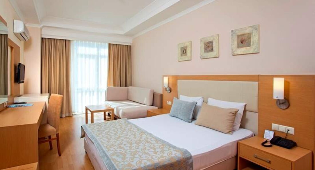 В первый раз отдыхали в Турции, попали в этот отель. Новые, чистые , светлые номера. Кормили не плохо. Море минутах в 7 ходьбы. В номере холодильник, сейф(платно), телевизор жк(1 рос. канал). Персонал приветливый.Из минусов: далеко от аэропорта ок. 3 часов ехали, основной контингент пожилые немцы, голандцы. Отдохнули в принципе хорошо, но на тот момент особо не с чем было сравнить. Сегодня имея некоторый опыт в путешествиях могу сказать на 5 не тянет, 4 вполне оправдывает.