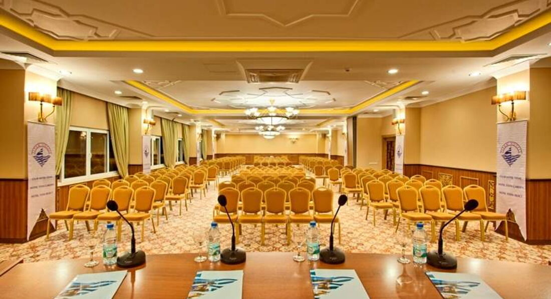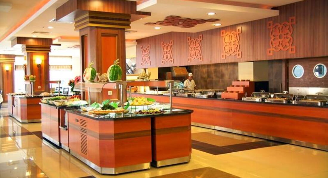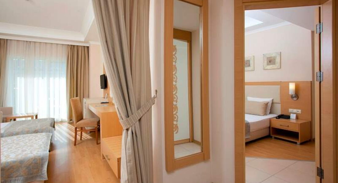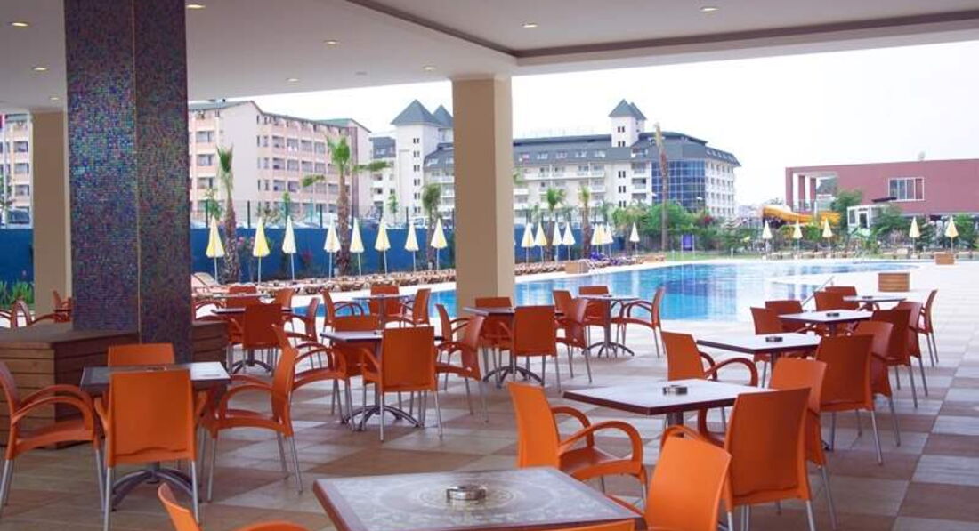 Приехали в отель вечером, персонал на русском не разговаривает, дали номер 5233. В принципе обычный номер стандартный, как в четверках и тройках. С виду все работало. В последствии как оказалось работал нормально только холодильник, кондиционер вообще не работал, отключен полностью, т.к. его оккупировали ласточки,их пугать нельзя, душ - для того,чтобы его переключить, нужно долго материться, кран никель облезлый, полотенца просвечиваются, висят нитки, фен - при перегреве отключается, короткий волос можно высушить за 2-3 отключения. Стены грязные, у меня над кроватью следы обуви были, видимо пытались убить комара, шторы - рванина, просто драные шторы, в которых мы путались и рвали еще сильнее, пока мама не выдержала и зашила им штору. Стоит заметить, набор для шитья присутствовал. На балконе вешалка имеется, а так же имеются висячие трупы насекомых на стенах и окне, перья и дерьмо ласточек. Сейф на кнопочках, и ключ электронный. Порог был оторван, спасибо на 6 день заметили и приколотили, разрезать ногу не успели. Постель более приличная, правда за весь отдых полотенца и постель не меняли. Ужин до 21.00, поэтому мы в первый раз в жизни успели на ужин. Я думала, почему в отзывах нет фото еды в ресторане, просто все горячие блюда закрыты крышками. На протяжении 12 дней блюда практически не менялись. Завтрак фрукты, сыры, оладьи, яйца 3 мин, 5 мин. варки, яичница, помидоры огурцы, изюм, оливки, маслины, трава с 7-10 утра.Фрукты в ресторане - персики, абрикос, арбузы,дыни, яблоки, апельсины, грейпфрут, из мяса - курица, индюшатина,иногда баранина. Вообще не понимаю кто им дал 5 звезд,номер: кондиционер вообще не работал, т.к. на нем свили гнездо ласточки,№5233. Шторы драные, мама зашивала сама, потому что запутывались в них, кран облезлый, душ проблемно переключается, шланг на душе вот-вот лопнет, фен перегревается, отключается, полотенца местами просвечиваются, нитки висят, стены в номере грязные, на балконе стены, стекла в трупах насекомых, полотенца не меняли за весь отдых, соответственно и простыни тоже. К стенам прибит гель для душа, мыла, шампуня нет. После этого геля попробуй продери волосы, но для начала попробуй его выдави. В защиту ради скажу мыла полы горничная хорошо, краж не было, даже не брала сейф, кольцо с бриллиантами лежало в ящике тумбочке, персонал в ресторане отличный, на ресепшене тоже помогут, правда на русском не говорят. Отдыхающие в этому году немцы, французы, поляки, чехи и т.п. Соответственно озабоченные. Геи, бабки, которым сам Гитлер сказал, что они сексуальны, рвутся загорать топлес, парочки постоянно ощупывающие органы, инвалиды. Детей практически нет. Меню для детей тоже нет, анимации детской не наблюдала. Горки видела только раз включенные. Пляж чистый, дно без камней, лежаков хватало, но у иностранцев болезнь - занять лежаки у бассейна, у моря и вообще этим не пользоваться, один раз кто то умудрился занять стол в ресторане и так и не явились.По пляжу шляются пьяные местные, пристают, никто им слова не говорит.Цены в отеле в евро,сейф 2 евро или 6 лир,баня 35, маникюр 10. Короче, в этот отель ни ногой.