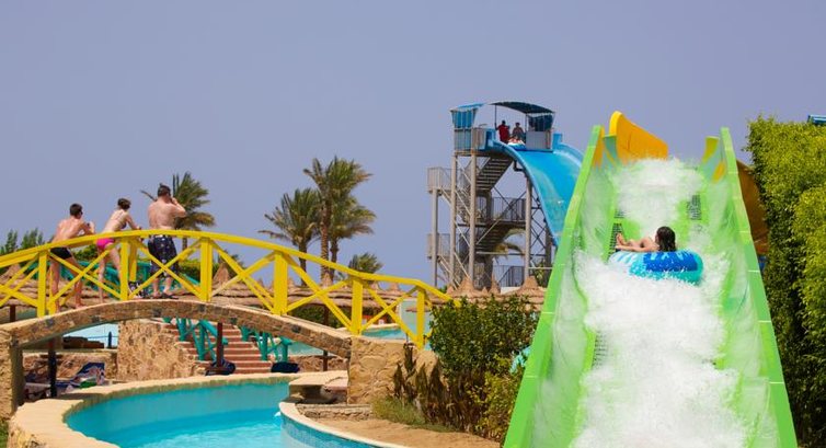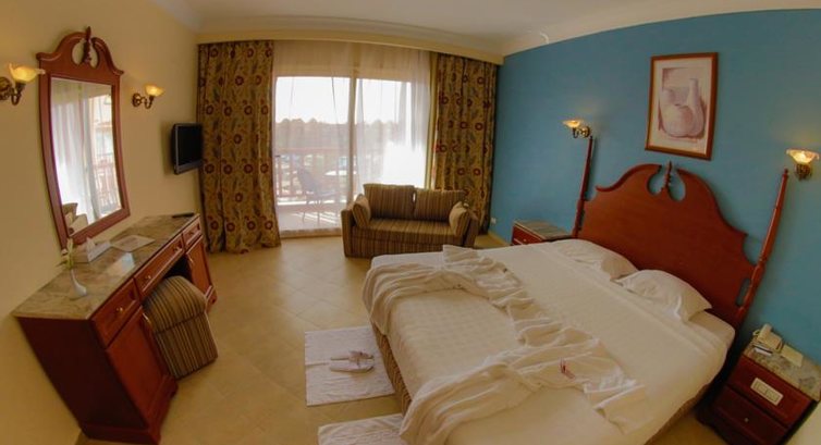 Давно хотела написать отзыв об этом отеле и отдыхе, тк часто вспоминаем с мужем:) Это была наша первая поездка в Египет, было тогда "военное положение" (07.03.14-15.03.14), но мы рискнули. В аэропорту мы прошли несложные манипуляции по оформлению визы и сразу же нашлись с туроператором (тез тур), быстро и организованно погрузились в автобус и приехали в отель к 10:30. заполнили анкеты и положа 10$ в паспорт заселились в номер, 2этаж корпус у аквапарка. Номер нормальный, никакой живности кроме комаров (открыли шторы на целый день) не было. Воду, как и везде рекомендуют, не пили из под крана:))) зубы чистить только бутилированной. Воду и напитки дополняли каждый день (оставляли бакс), дополнял наш уборщик по просьбе бар водой, тк спрайт и кола не интересовала. Аквапарк- не самый большой, но и не 2горки, достаточно чтобы развлечься и гигантских очередей нет:) Пляж...на пляже мы не валялись, загорали на пирсе, тк купаться можно только оттуда (мелко, по щиколотку метров 400), но зато какой там красивый подводный мир:))) мы кормили рыбок из рук (капусту и морковку брали из ресторана), видели осьминога, и кучу красочных рыбок:) много ежей, поэтому плавали и по морю ходили в резиновых тапочках. Питание было разнообразнее, чем в Турции (Ozkayamak Falez), а вот напитки...промолчу, пейте воду:))) Но свежевыжатый сок за 4бакса великолепен:) Что касается экскурсий- мы не пожалели ни об одной! Гиды настолько позитивные и классные, что складывалось ощущение, что это наши давнишние друзья:) Поездка на сафари с ужином запомнилась самой поездках на квадроциклах!:) на верблюдах покатались, бедуинов увидели (жалко их), из песка показали как делают незамысловатые картинки в сосудах. Все можно было преобрести и сразу скажу - да, везде выпрашивают доллар!:) Но не судите их строго, очень бедный народ. Вымогательства нет,но настойчивое выпрашивание-да! Поездка в Луксор - круть! Настолько прошаренный экскурсовод (кажется он был учителем) всю историю 4-8 класса про Египет освежил в головах:) Увидели как живут не в курортных городах люди, гробницы, по Нилу прокатились, Карнакский храм, Колоссы Мемнона (там чай и кофе народ покупал, как оголтелый:))) на обратном пути нас всех угостили мороженным:) Самая крутая и запоминающаяся поездка-это яхта!!МММ:))) Из прекрасного места Сахль Хашиш ( в след.раз там отель будем бронировать) сначала нашу группу завели в спа: пиллинг Гарра Руфа, массаж и мойка ног. Потом на пристань и небольшая яхта повезла нас кататься:) мы плавали в море (потрясающий подводный мир!!!) несколько раз делали заплывы 1,5 часовые, а на яхте готовился обед,ммм (не Турция!!!!!!! кто был в Турции поймут) на мангальчике жарились креветочки, супчик из краба, рыбы и что-то еще морское, вкусные закуски (не как в отеле, что разнообразило отдых), фотосессия и танцы на карме- в общем, было очень весело и позитивно, не хотелось расставаться. Ах,да! рыбалка еще была:) Но как-то не особо повезло с уловом:) Мы вообще в шторм попали под конец-было экстремально! Купили масла и что-тоеще,но пожалела, что не взяла больше алоэ крема- классная вещь! Сходили в спа (120 баксов на двоих)в Турции дешевле, но мы не пожалели! В общем, берите с собой хорошее настроение и не нойте! Про отравления и что-то подобное: с собой всегда надо брать аптечку и не жрать все подряд, как в последний день Помпей:))) у нас все гуд было с животами, ТТТ! Еще, Египтяне реально н
