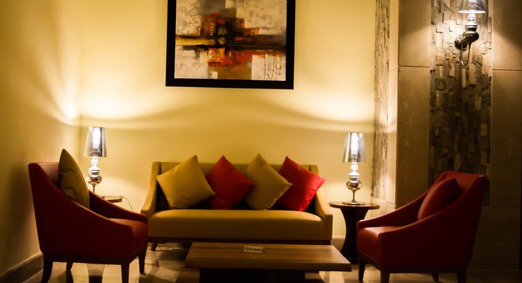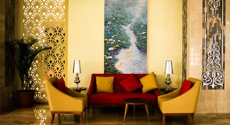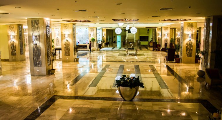 Симпатичное внутреннее оформление отеля, со светильниками длиной в 4 этажа, наверху (на 4-ом этаже) много маленьких столиков с парами кресел. В корпусе имеется множество лифтов, кое-где по два рядом, то есть практически никогда не приходилось его ждать.