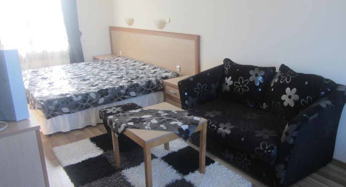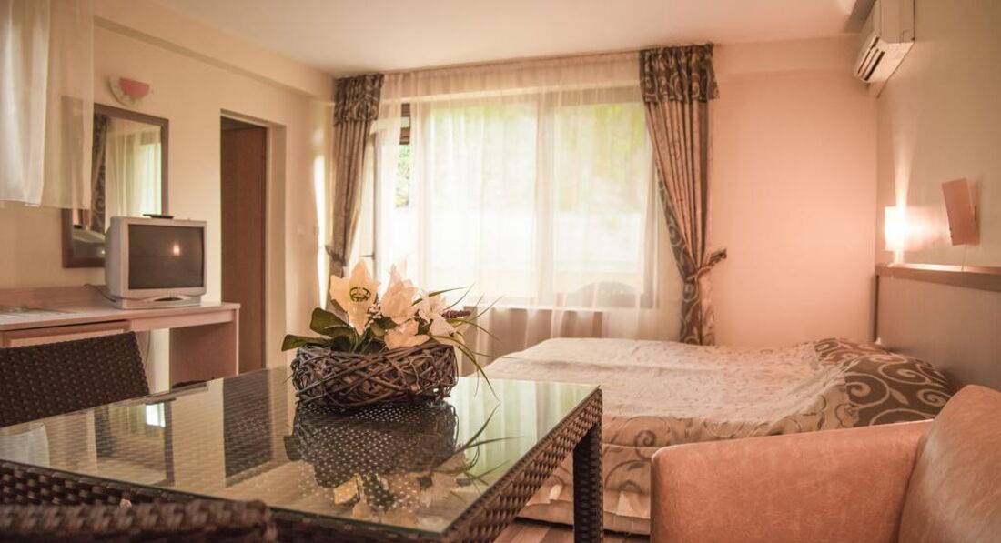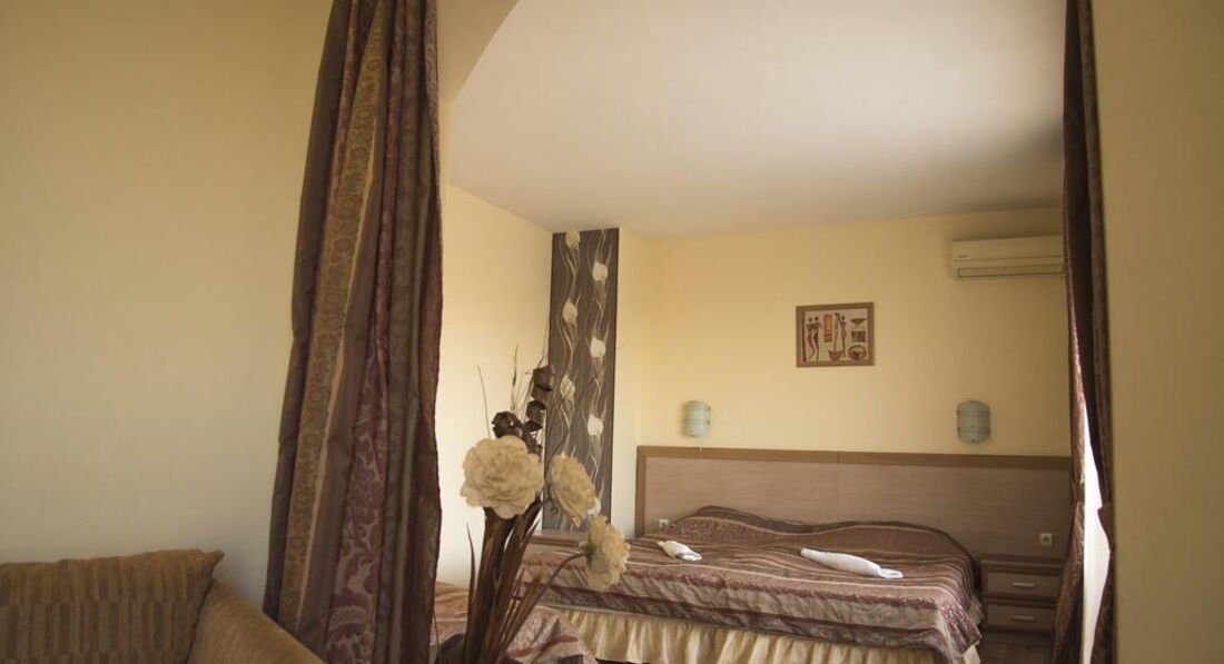 Номер нам попался 212, хороший номер на троих. Матрасы не самые новые, унитаз шатался, кондиционер работал, балкон большой. В целом номер понравился, но немного напрягло отсутствие чайника в номере. В отеле убираются каждый день, но качество уборки оставляет желать лучшего, но.... Районы Золотые пески и Чайна сами-то не очень чистые. Мусор на улице и неимоверное количество заброшенных зданий и участков - это нормально для болгарии. Я поняла, что это у них менталитет такой.