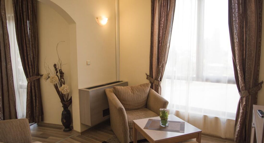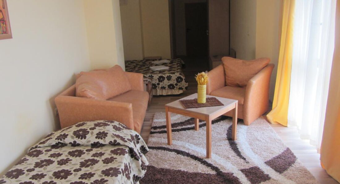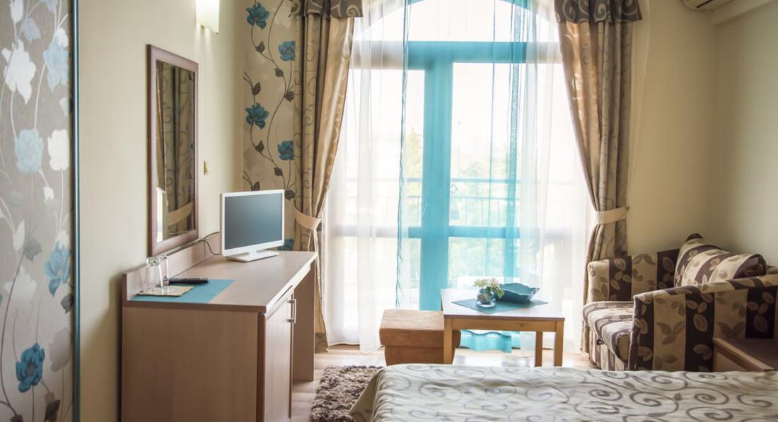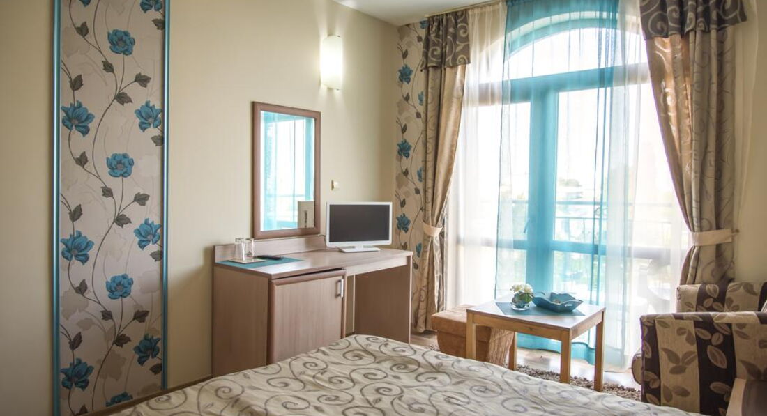 Отель понравился. Новый, красивый, уютный. В номере хорошая мебель. Новая хорошая сантехника. Брала только завтраки. Турецкого разнообразия не ждите, а так все вкусно. Утром в меню : колбаса, яйца, омлет, макароны с сыром, помидоры,огурцы, 2 вида сыра,арбуз, гренки, мюсли,молоко,травяные чаи, мед, булочки,варенье. Кто не фанат еды, нормально. На ужин говорят более разнообразно, были фрукты и пироженые, так что советую брать завтрак - ужин. Персонал приветливый, русский язык понимают, если что то надо- подскажут. Территории у отеля нет, рядом дорога, но напротив отель Детелина где есть бассейн , там можно купаться. До моря 10 минут, пляж хороший, называется Кабакум, где то с 1 км. Лежаки , зонтики платные. Цены разные. В начале пляжа 6 лев ( 120 руб) зонтик , 6 лев лежак , дальше по 2 лева ( 40 руб) там можно купить один зонтик и пользоваться целый день. Можно купить свой зонт за 200 руб и ходить с ним, в начале пляжа разрешают. Пляж чистый , вода тоже чистая, была в июле, погода замечательная, изнуряющей жары нет. Местность примерно как наш Дагомыс, считается пригородом Золотых Песков , вечерами тихо и спокойно, в отеле тоже. Болгария удивительная ,красивая , самобытная страна , которую надо обязательно посетить и обязательно посетите экскурсии, мне очень понравилось