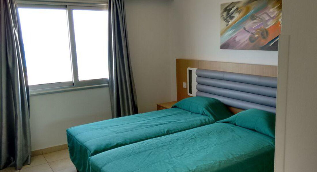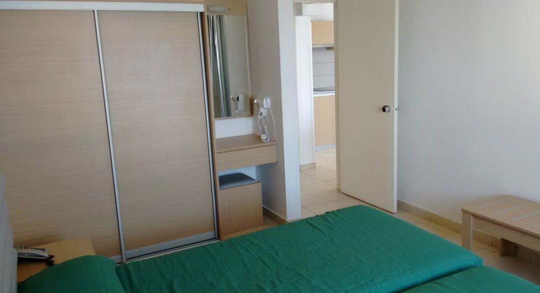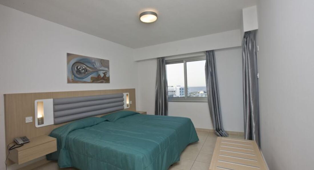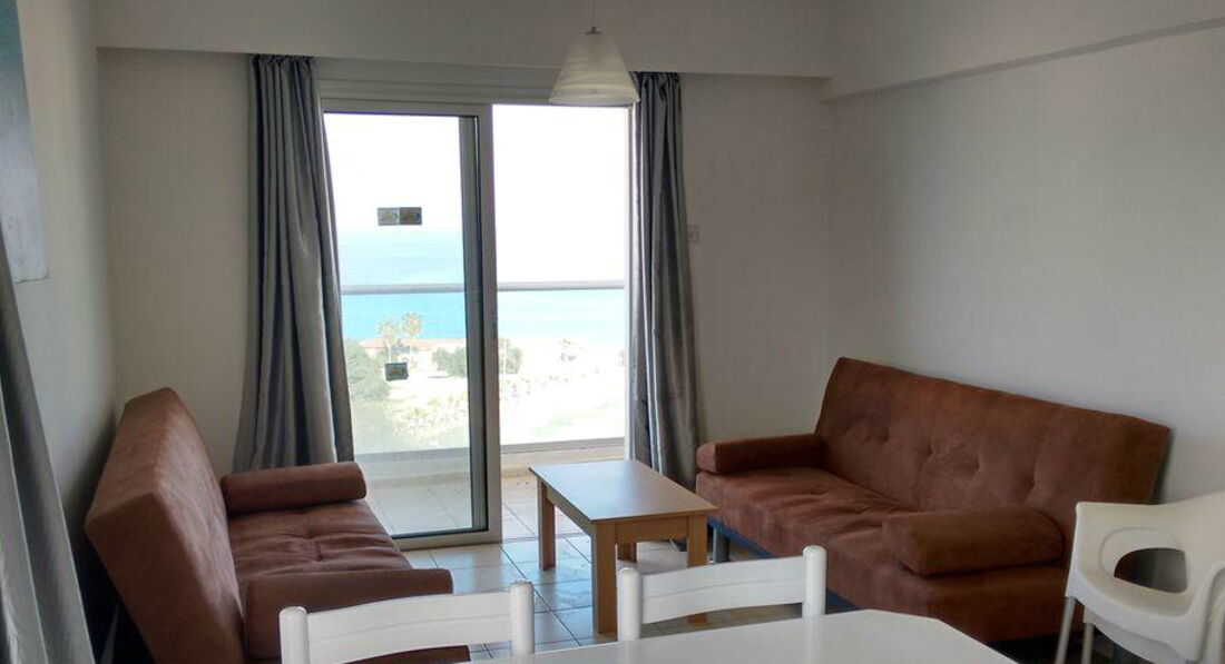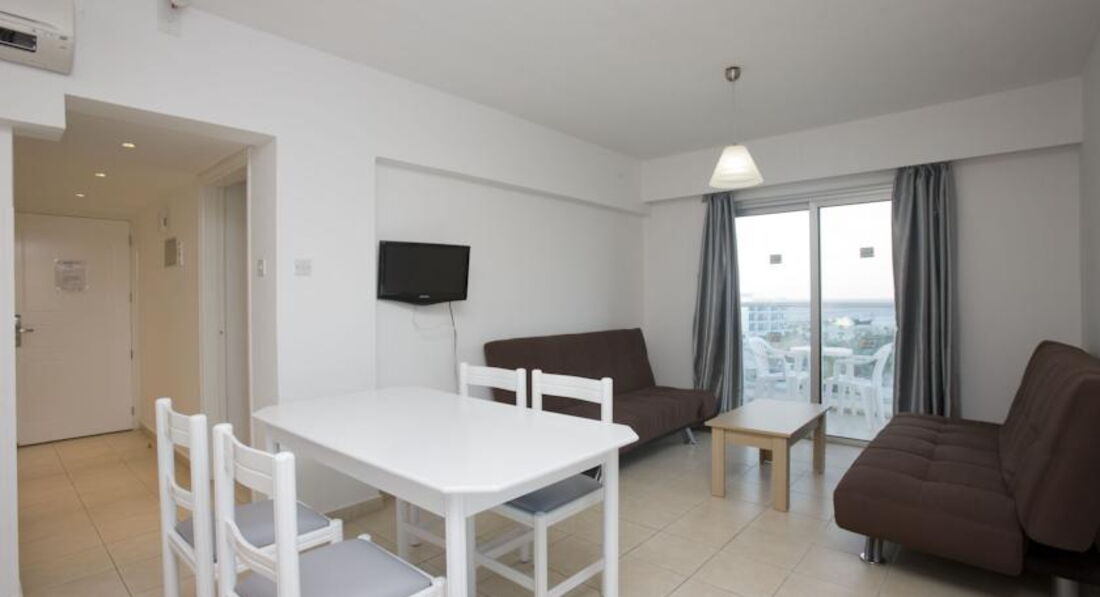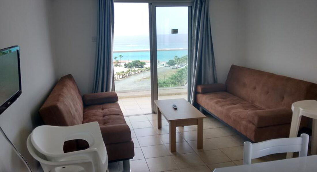 One Bedroom Apartments side sea view – частковий вид на море, окрема спальня з двома ліжками, вітальня поєднана з кухнею, додатково диван-ліжко (хв. 2-4 особи, 45 м2)