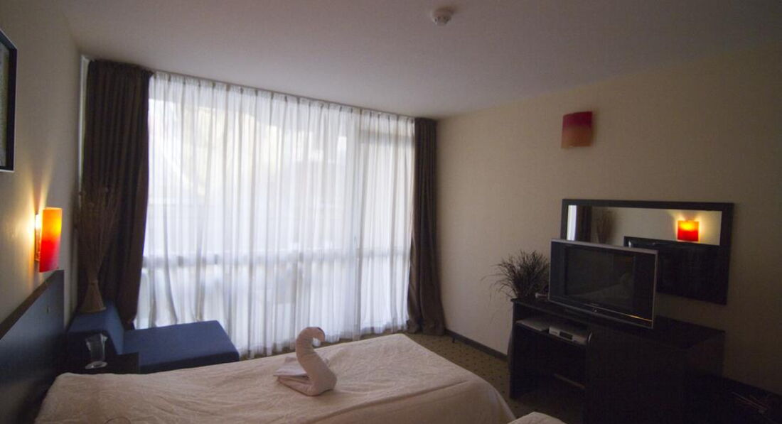 Номер – стандартный для 3-звёздного отеля: двуспальная кровать, раскладное кресло для детёныша, балкон с 2-мя пластиковыми креслами и столом, сушилка, ТВ с немереной кучей русских каналов, платный сейф (4 лева в день, 1 лев – чуть более 20 руб.), телефон, душ, фен, небольшой холодильник, центральный кондиционер. Всё, что должно дуть, греть, охлаждать, поливать, смывать, звенеть, показывать и развлекать, – работало без вмешательства оч.умелых ручек.