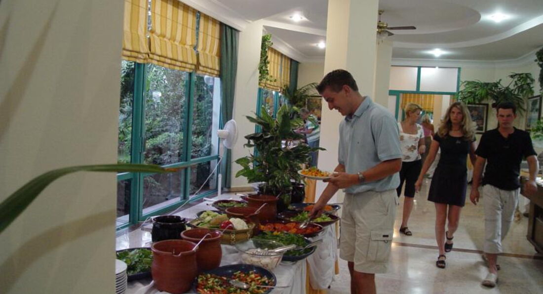 , туристов в это время мало. К питанию претензий нет, хоть сезон еще и не начался, еда была разнообразная и вкусная, на обед и ужин мясо-гриль (индейка, говядина, курица), очень вкусное тушеное мясо с разными соусами, овощи-гриль и свежие овощи, перечислять можно долго, да и рыба тоже была и тушеная и жареная. Алкоголь хорошего качества, пиво разливное Туборг, всегда несколько видов кофе, горячий шоколад, вкусный чай и печенюшки. Менеджмент в отеле очень хороший, отдельное спасибо старшему официанту Тэфику. Территория отеля небольшая, но чистая, ухоженная и очень зеленая, бассейн достаточно большой и всегда чистый, мы , правда только сидели по-вечерам у бассейна, а так 100 м от отеля пляж и прекрасное море. Отель расположен между центром города Мармарис и поселком Ичмелер. где то посредине и их соединяет великолепный променад с красивейшим морем и цепочкой отелей, расположенных среди сосен и пихт, мы брали велосипеды и ездили в Ичмелер, там очень красивые пейзажи и каналы с мостиками, напоминающими маленькую Венецию, а в Мармарис ездили на велосипедах в порт, смотрели яхты и просто гуляли, городок очень европейский, чистый и красивый. Брали только одну экскурсию в Дальян (так как Турцию уже объездили всю....) советуем взять на улице у Валентины, прямо напротив отеля. Туристы, которые прибыли с нами из Санкт-Петербурга купили у Интуриста за 50 долларов с человека и остались не довольны: их возили на автобусе. покормили плохо и удовольствия не получили. А мы купили у Валентины за 18 долларов (правда это не сезон, думаю летом будет 25). но зато мы плыли на корабле, где на верхней палубе стоят шезлонги и можно загорать, затем нас покормили хорошим обедом и сплавляли на лодках в дальян. где песчаная коса разделяет средиземное море и пресное озеро, затем купание в море, грязи и источники, вся экскурсия 10 часов. Прокат велосипедов на полдня 5 лир (1 лира=16 рублей) с человека. Уборка в отеле ежедневная и совсем не навязчивая, приходишь и уже все убрано. Отдых превзошел все ожидания, обязательно вернусь сюда еще раз. Отель советую всем, но особенно тем, кому нужен тихий, спокойный отдых.