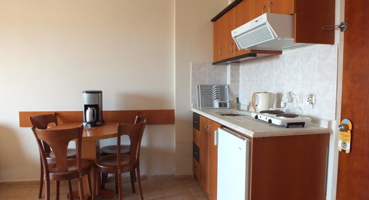 Фото отеля соответствуют действительности. Номер очень порадовал - 2 комнаты, кухня-гостинная и спальня, отличный балкон, на нем сушилка для белья, и еще дополнительный стол и 4 стула. На балконе мы всегда и кушали. Оттуда открывался вид на море. С утра дул ветер с моря и было прохладно, после обеда в наши окна светило солнышко и было жарковато. Кондиционер за отдельную плату. Учтите - комары! берите с собой раптор или тп