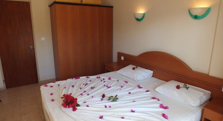 В номере. Гостиная, она же кухня с обеденным столом, диваном, креслами, столом с зеркалом.Телевизор (не включали),кондиционер платный (пульт на ресепшене брать). Хорошая спальня с двойной кроватью (у нас). Сан.узел нормальный, ванна со шторкой. Всё работает. Вода горячая, правда, к ночи заканчивается. Но это в Турции обычное дело, потому что воду у них греет солнце. Лоджия большая, на всю ширину номера, выход с обоих комнат. На балконе была сушилка (очень удобно) и пластиковый стол со стульями. Ели только там. Вид на закат словами неописуем.