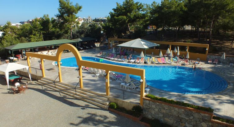 Из-за того, что отель на горе, ресепшн и лобби получаются на 3-м этаже, а под террасой ресторана еще два этажа.С террасы вид на море тоже норм. Есть бассейн с лежаками (так ни разу и не окунулись), бар. За бассейном на холме детская площадка, пара гамаков в соснах. Такого хвойного запаха нигде больше не встречал! Чуть дальше постояльцы ставят машины. В отеле есть минимаркет, если идти куда-то лень, то воду и кое-какую еду купить можно.