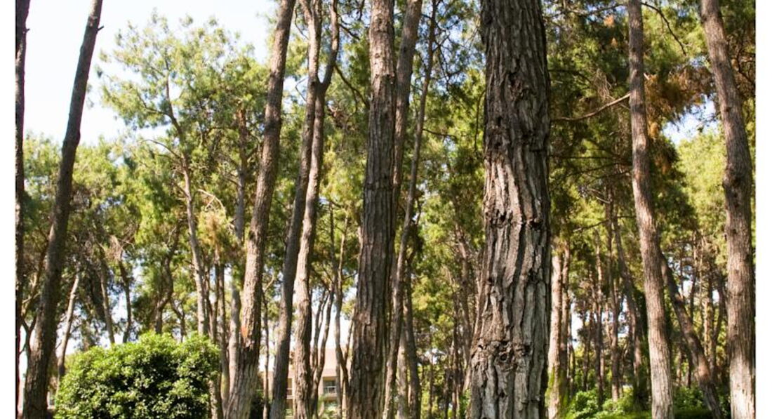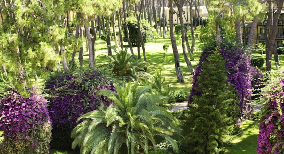 Отель находится на первой линии,при этом ооочень много зелени, много пальм и основых деревьев. Утопает в сосне!