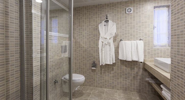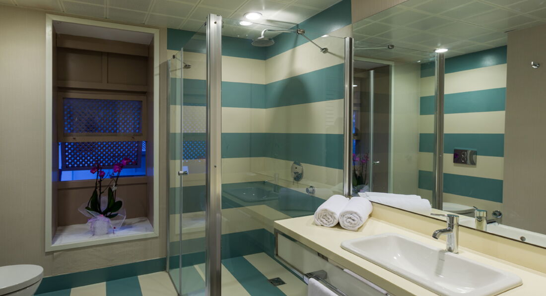 Разместили ночью моментально, вежливо и сразу в понравившийся нам номер. Номер семейный, но никаких двух санузлов или двухъярусной кровати не было. Были две закрывающиеся комнаты, два кондиционера, один телевизор и увеличенный балкон. Номер был в корпусе Замок, прямо над рестораном (второй этаж из трех). Ночью покушать или попить безалкогольных и слабоалкогольных напитков в основном ресторане можно, но ввиду почти полного отсутствия людей после часа ночи, ассортимент еды абсолютно минимальный, а барменов надо искать. Проблема актуальна при ночном приезде. В целом, конечно, по ночам лучше спать. В ванной есть два диспенсера, неподписанных правда (похоже, что гель в одном и гель в другом ). К номеру есть минимальные нарекания – страшная обсыпанная балка над душевой кабиной, тугой смеситель в раковине – или воды нет или ее много, но это не существенно. Кондиционеры работают, телевизор ТНТ показывает идеально.