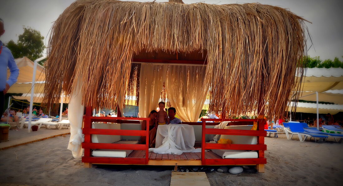 Пляж неплохой, завозной песок на суше и в воде. Из–за этого вход в воду стал мягкий и пологий, что очень удобно для детей и пожилых людей. Но это только справа от пирса, слева вход в море уже каменистый. Не очень понравилось то, что лежаки стоят ну оооооочень близко друг к другу + общий тент над головой и никакой уединенности, вечный шум вокруг... Из–за этого не покидало ощущение, что ты на черноморском курорте :)))) Но опять же – вопрос цены за отдых. В более дорогих отелях, где мы были, пляжи были комфортнее...