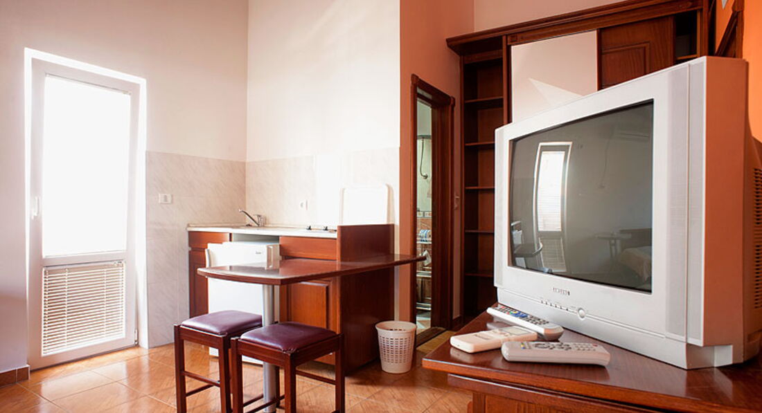 STUD 03: однокімнатний номер, поєднаний з кухнею, французьке ліжко та односпальне ліжко, міні кухня з необхідним посудом, холодильник, телевізор, інтернет, кондціонер, санвузол та балкон з видом на гори або на море.