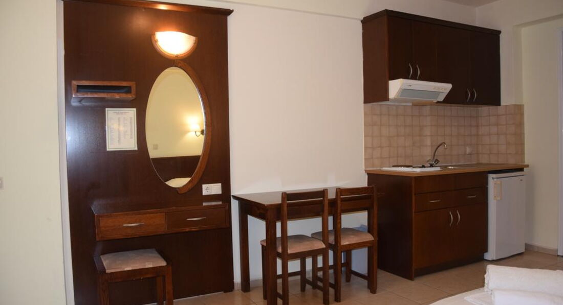 Типи номерів: Studio 2 pax Двоспальне ліжко або 2 односпальні ліжка. Studio 3 pax Двоспальне ліжко або 2 односпальні ліжка та диван-ліжко. Apartment Двоспальне ліжко та 2 диван-ліжка.У номері: кухонний куточок кондиціонер (за доплату) ванна кімната (душ) фен телефон сейф (за доплату) балкон/тераса ванна/душ кухня холодильник