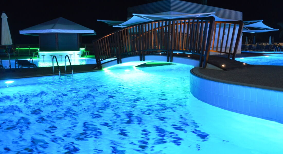 Бассейны на территории отеля отличные, с пресной водой, хлоркой особо не воняют. Дальний бассейн с гидромассажем двух видов. Для деток есть одна водная горка и 2 рыбки, плюющиеся водой. Определенно не хватает детской площадки, хотя место под нее есть возле главного ресторана (там просто зеленая поляна). С шезлонгами у бассейна действительно есть проблема, их не хватает, особо додельные туристы занимают их и даже не приходят. Нас это не сильно беспокоило, т.к. мы почти все время были на море.