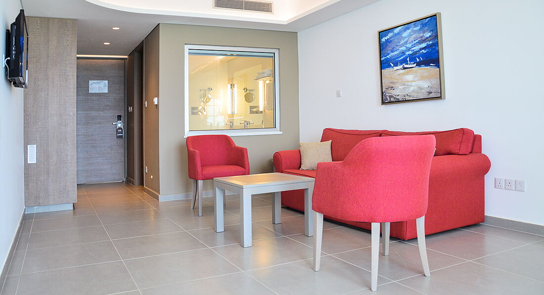 6 Beach Suites Nissi Bay View (82 м2). Ванна. Джакузі. Перегляд номера: на морі. Кімнати в номері: спальня та вітальня. Ліжка: 1 двоспальне або 2 односпальні. 2 ванні кімнати.