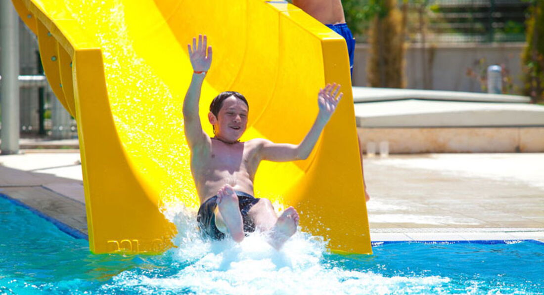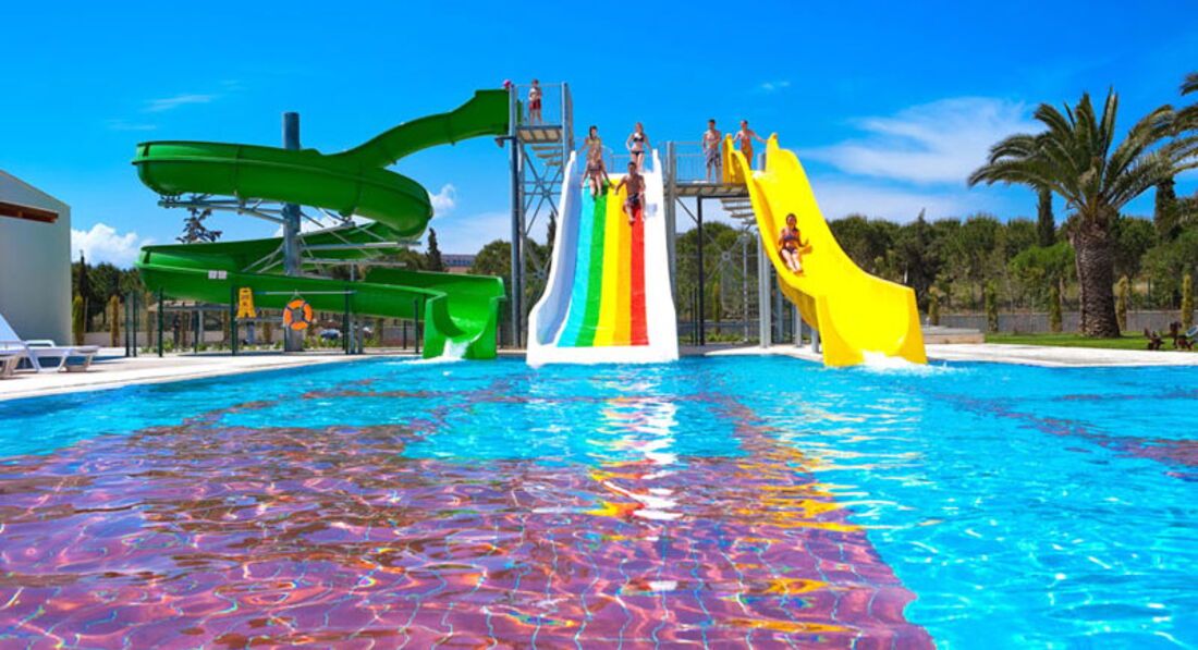 Бассейны (2 взрослых открытых и 1 детский), в центральном можно поплавать, и анимация там же; в другом 3 взрослые горки. С 11 до 13 и с 15 до 17. Я каталась, муж сказал, что беспантовые, маленькие.
