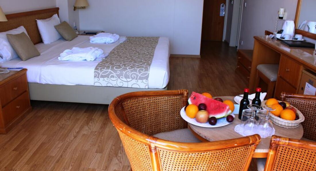 Отель на твердую 4*. Номера чистые, но требующие обновления. Территория не очень большая, но уютная, есть открытый и закрытый бассейны. WI-FI-бесплатно. Питание HB и AL, все было вкусно. Пляж есть, заход в море песчаный, но на пути огромные плиты, и нужно быть очень осторожными ,чтобы не поранить ноги. Детям в море делать нечего. Между пляжем и бассейном большой газон с пальмами, под которыми много лежаков и зонтиков.