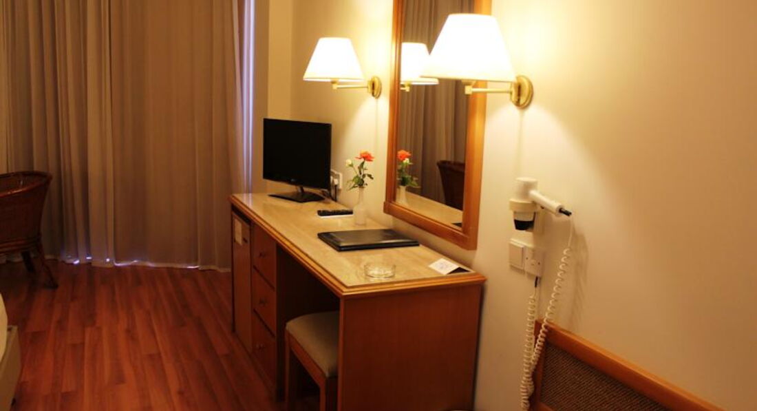 Заселение в номер. Мы прибыли уже под вечер, заселили без проблем. Номер хороший, с боковым видом на море. Все в номере есть, фен, шампуни-гели для душа, телевизор. Сейф платный. Переходник на евро-розетку можно одолжить в отеле. Убирали номер очень хорошо.