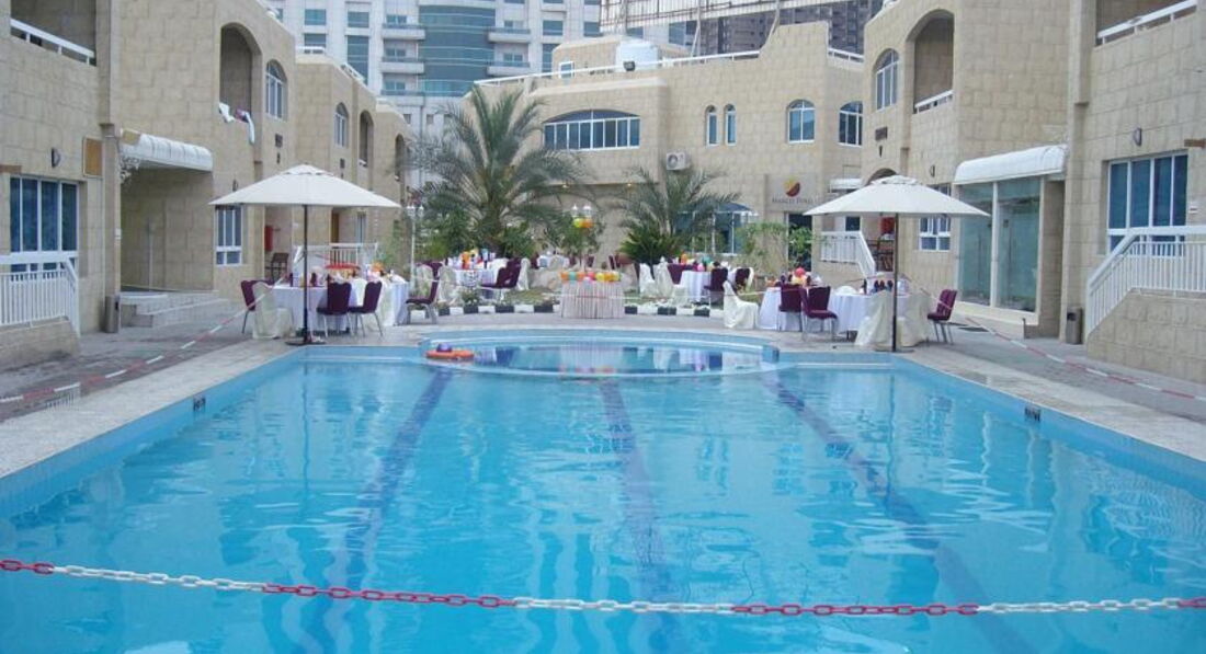 В ОАЭ ездили за шубами, ни сколько не пожалели выбрав этот отель. В Шардже бассейны на крыше у всех отелей, многие жильцы 5*-ых отелей просто нам завидовали. Море рядом, своя территория.. Бассейн с теплой водой, джакузи, две сауны. Все на улице просто супер. Очень внимательный персоонал. В номер ложили тапочки шампунь гель и ласьен. Так ж всегда кофе в пакетиках, чай, сахар. В номере две кровати, стол, стулья, шкаф, сейф, чайник, фен. Номера конечно немного староваты, обои немного ободраны и темно. Нет балкона. Но если в отеле только ночевать это незаметно.В целом отдых понравился очень. Завтраки очень хорошие.