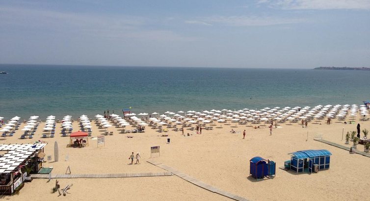 На пляже, как врочем и везде, на Солнечном береге, лежаки и зонты платные. Но совсем рядом есть пятачок, где нет зонтов и шезлонгов и можно разместиться прямо у воды. Правда рядом место откуда отплывают лодки и водные мотоциклы, но в начале сезона это не мешало нам. Так как желающих погонять было мало.