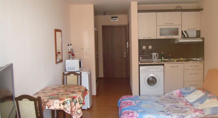Номер нам дали на третьем этаже, с прямым видом на территорию и море. Номер просторный, студио. Чистый. Мебель простая, но не старая. Двери закрываются на ключ, на вид хлипковаты, так как отель был полупустой нас это не смущало, особых ценностей у нас не было. В номере ванны нет, гибкий душ без шторки и поддона, вода уходит в слив в полу. Сначала это огорчило, но вода уходит быстро и нет сырости. При включении света в санузле включается вытяжка. Выдали два больших и два маленьких полотенца. Пляжных полотенец нет и не было заявлено. В номере полноценная кухня. Электроплита с духовкой, тостер, мойка, шкаф с посудой и столовыми приборами, чайник, холодильник и даже стиральная машина. Отель я бы рекомендовала непритязательным активным туристам. Можно с детьми. Есть где готовить кашки, рядом парк с детской площадкой. Расположение отеля шикарное. Рядом дикий пляж, до городского метров 500. Магазины и столовые в пешей доступности. Вечером можно неплохо посидеть на балконе с нарезками из местных вкусностей и и вином. Телевизор не ЖК, много каналов. Три канала русских. Сплит работал, стиральной машиной пользовались. На балконе есть сушилка. В супермаркете покупали воду и вкусности. Этим завтракали. В местных столовых на двоих можно поесть за 12 лев (480руб). Но все будет зависеть от ваших аппетитов. В кафе цены чуть выше чем в столовых.