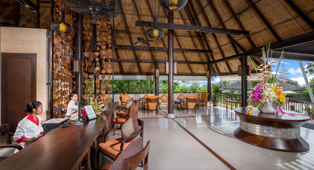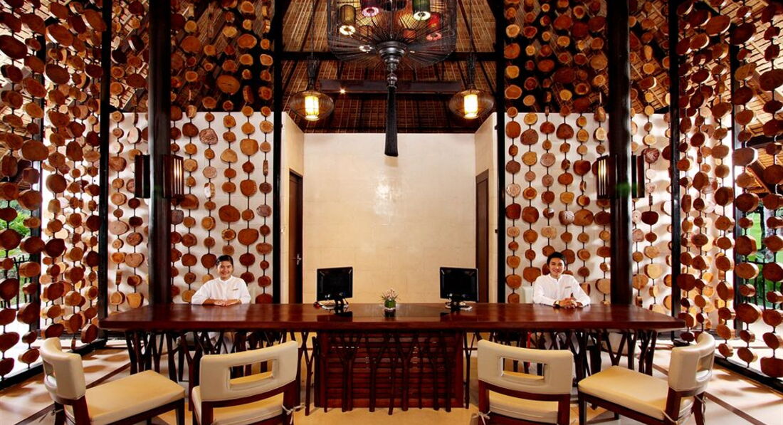 На ресепшн нас очень приветливо встретили, напоили лемонграссовым холодным чаем, дали охлажденные полотенца, чтобы освежиться (после 9-часового полета это было весьма кстати), все рассказали, выдали карту территории отеля, показали на ней, что и где находится (рестораны, бассейн, СПА, ротонда с магазином, библиотекой, детской зоной и т.д.), карту гостя, ключи, все четко и понятно. In english. Русско-говорящего персонала на респешн нет. Потом на бАгги (так у них называются электро-кары) повезли на нашу виллу, параллельно провели экскурсию по территории, еще раз все показали. Нам дали виллу 67, я сначала немного расстроилась, что далеко от моря, на самом верху горы, на которой расположен комплекс, но потом поняла, что это очень даже и хорошо. Во-первых, во время отливов вид моря, действительно, оставляет желать лучшего, но бОльшую часть обнаженного дня закрывала для нас буйная растительность, пальмы и другие деревья. ВО-вторых, действительно, как было уже кем-то в отзывах сказано, если не дай бог что, землетрясение и цунами - мы были в бОльшей безопасности, чем все остальные виллы)) в-третьих, было ощущение, что чем ближе к морю, тем больше разной живности. Я - не любитель насекомых, и поэтому морально готовилась к худшему перед поездкой, но в общем-то с нашим расположением наверху все более-менее обошлось)) Ну и конечно, наличие бассейна на нашей вилле) это вообще) без комментариев, как говорится) как я заметила, в виллах у моря их в принципе не предусмотрено, так что это тоже несомненный плюс.