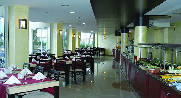 Бари та ресторани: Сніданок: з 7:30-10:00, пізній сніданок: з 10:00-11:00, обід: з 12:30-14:00, вечеря: з 19:30-21:30. Шведський стіл. Ресторан вміщує до 80 осіб у приміщенні та 80 осіб на відкритому повітрі. Дитяче меню: картопля, сосиски, курка, спагетті. Снек-бар. Лобі-бар, годинник роботи з 10:00-00:00. Бар біля басейну: годинник роботи: з 10:00-01:00 (годинник роботи залежить від погодних умов), закуски з 15:00-17:00, час чаю з 17:00-18:00; Бар на пляжі (платно).