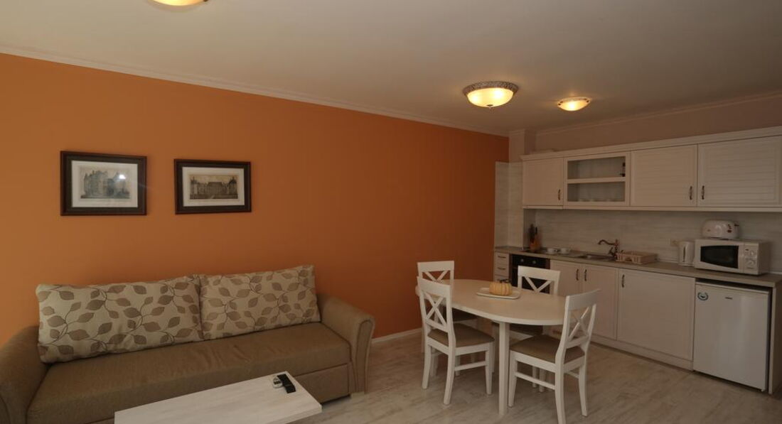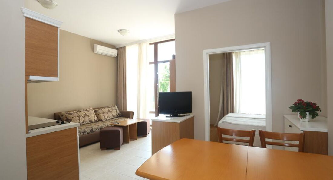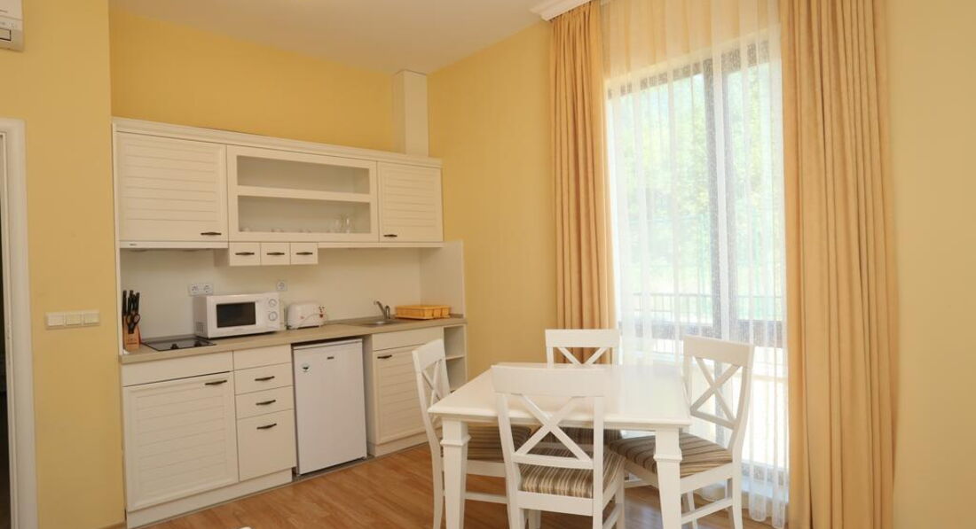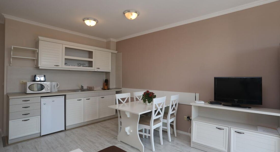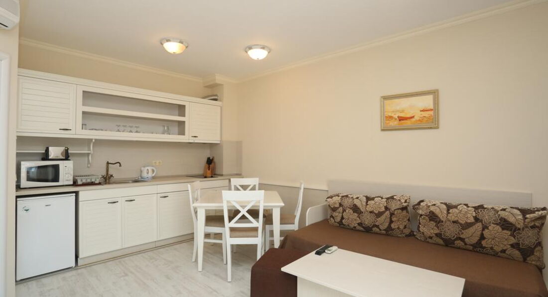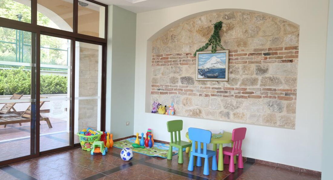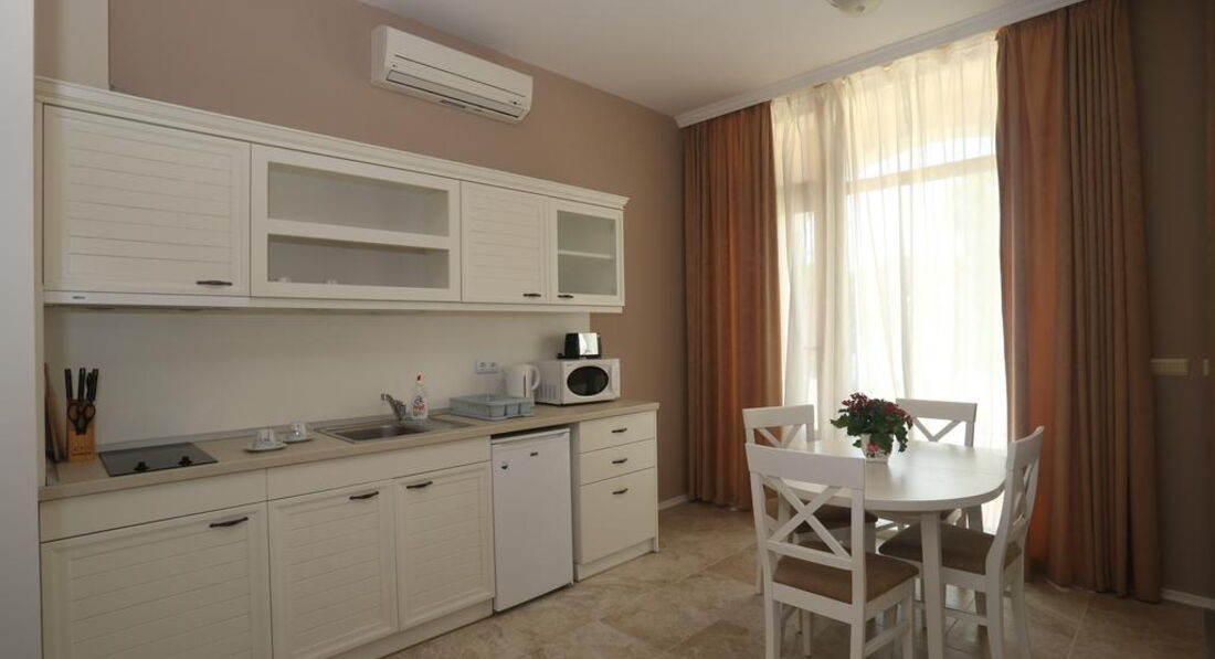 Отличный апартамент для отдыха с маленькими детьми. Есть игровая площадка с горкой и качелями на территории и игровая комната внутри. Мы ездили с детьми 6 месяцев и 1,5 года. Место тихое, после 22-00 тишина, дети прекрасно спят! Открытый бассейн с шезлонгами и барбекю. До моря меньше 50метров реально! Пришлось оценить ПИТАНИЕ, но питания НЕТ. Есть 3 ресторана в радиусе 100 метров, там вкусно и недорого кормят.