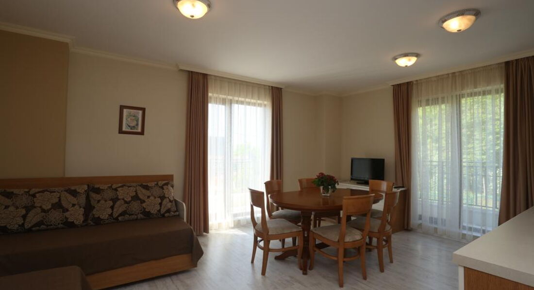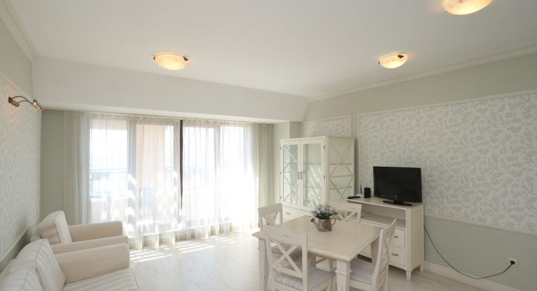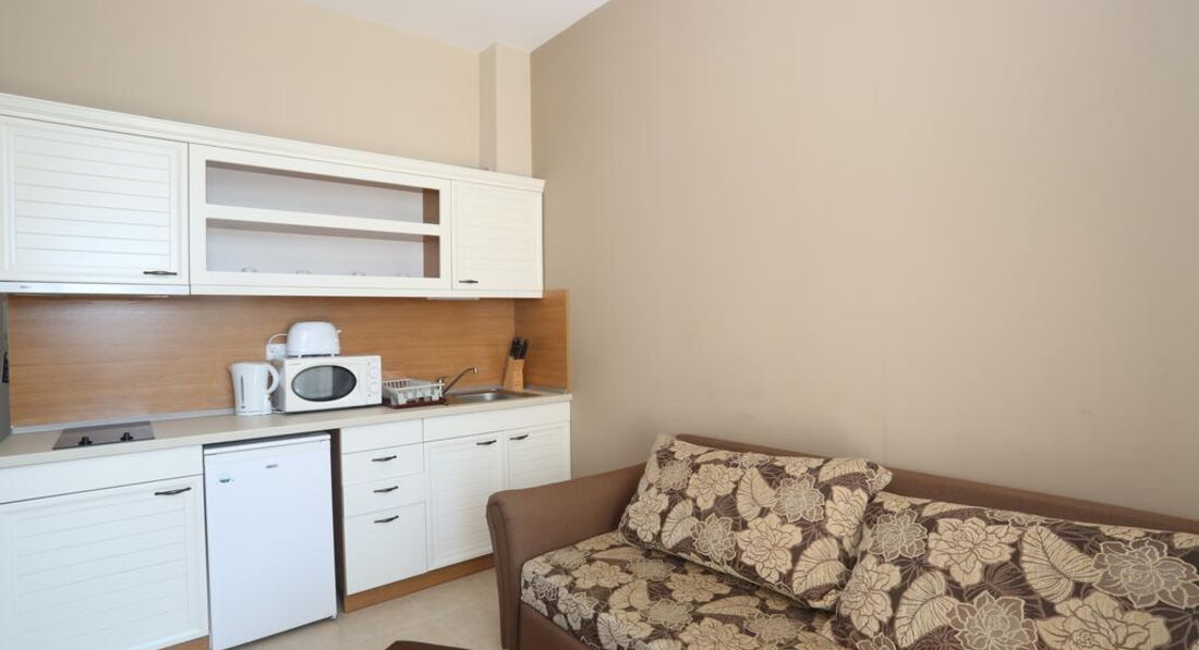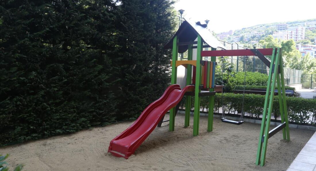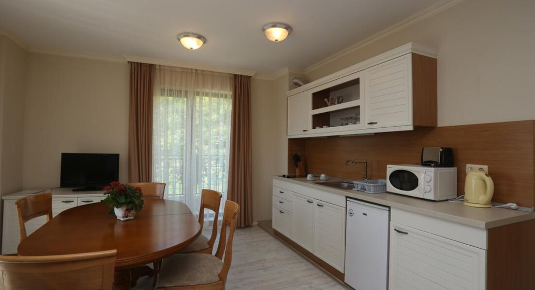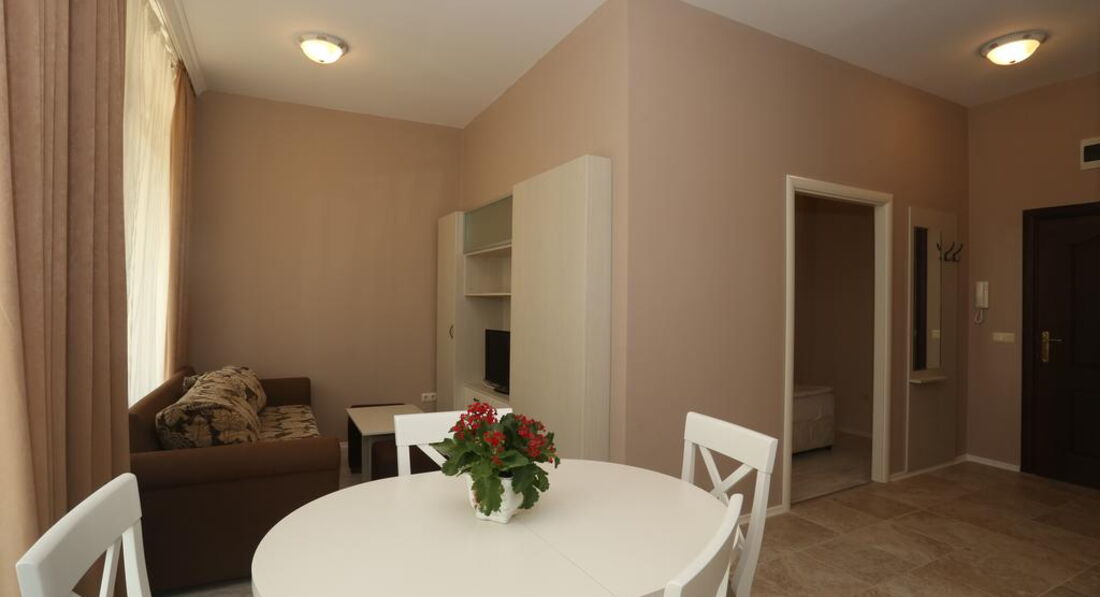 Отличный апартамент для отдыха с маленькими детьми. Есть игровая площадка с горкой и качелями на территории и игровая комната внутри. Мы ездили с детьми 6 месяцев и 1,5 года. Место тихое, после 22-00 тишина, дети прекрасно спят! Открытый бассейн с шезлонгами и барбекю. До моря меньше 50метров реально! Пришлось оценить ПИТАНИЕ, но питания НЕТ. Есть 3 ресторана в радиусе 100 метров, там вкусно и недорого кормят.