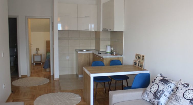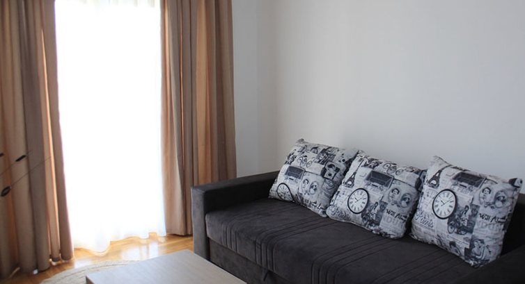 Апартамент розташований у чотириповерховому будинку в тихому спокійному районі Будви. Найближчий пляж Словенська плажа знаходиться за 600 метрів, Старе місто — за 750 метрів. Поруч розташовані кафе та спортивний зал, за 50 метрів — міні-маркет.