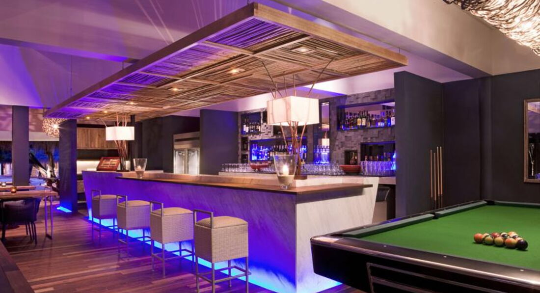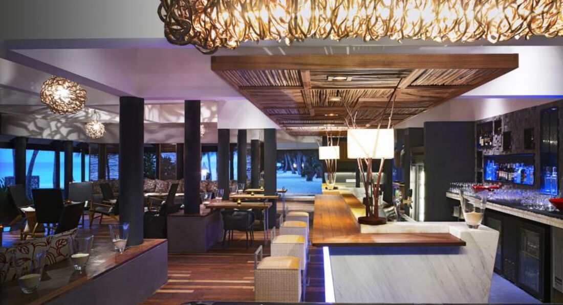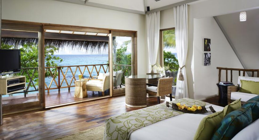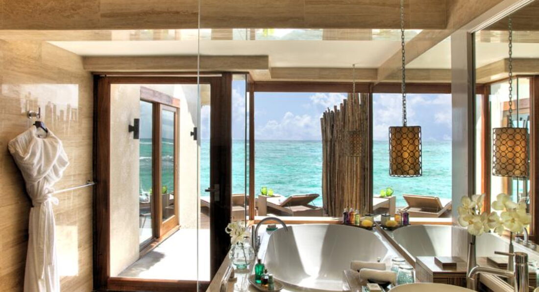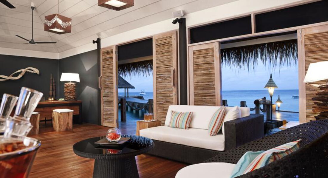 32 Indulgence-Deluxe Water Villa (85 м ², макс. 3 або 2+2 чол.). Просторі вілли над водою. Ліжко king-size, звернене у бік океану, широка тераса з шезлонгами та обідньою зоною. Ванна кімната з видом на лагуну, ванна та душова кабіна з зливовим душем. Зручні дерев'яні сходи з тераси у воду.