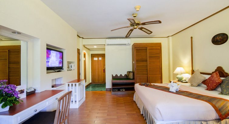 Номер довольно просторный, с большим балконом с полноразмерной деревянной мебелью в нем и снабженным противомоскитной сеткой (что немаловажно в тех условиях, ибо вечерами и в слякоть на улице комары зажирали немилосердно), у меня оказался с видом во двор отеля, дорогу не было слышно вообще. В номере отличная высокая и жесткая кровать, мебель натурального дерева, светонепроницаемые портьеры, все выглядит новым и приличным, плазменный ТВ без русских каналов, мощно морозящий холодильник с формочками для льда. Искусственного освещения хватало вполне за счет светильника во всю ширину комнаты, расположенного в карнизе. Санузел превосходный: ванна, отдельно большая душевая кабина, унитаз с отводом для гигиены, сантехника вся новая и качественная, неплохой для 4 звезд набор средств гигиены, ежедневно пополняемый. Кондей работал отлично, плюс имелся супер-мощный потолочный вентилятор. Помимо этого, в номере бесплатный сейф, незаменимые в том климате 2 зонта, пляжная сумка из соломки и такие же тапочки, фонарь, набор для чая, 2 бесплатные бутылки воды в день, пляжные полотенца, которые приносили ежедневно, также их можно брать у бассейна весь день в любом количестве, там же питьевая вода в металлическом баке с краником. По звонку приносят ДВД-плеер, утюг и гладильную доску. Лично мне не хватало ящика для белья и мелкой одежды, в остальном номер очень удобный и приятный глазу. Уборка ежедневная и добросовестная, единственная заминка происходила со сменой постельного белья, почему-то у меня получалось добиться оной, только бросив старую постель вместе с использованными полотенцами. Ни соответствующая карточка, ни звонки на ресепшн не помогали.
