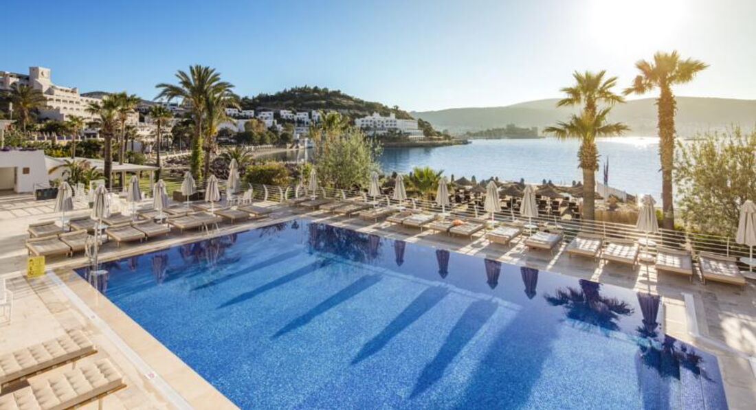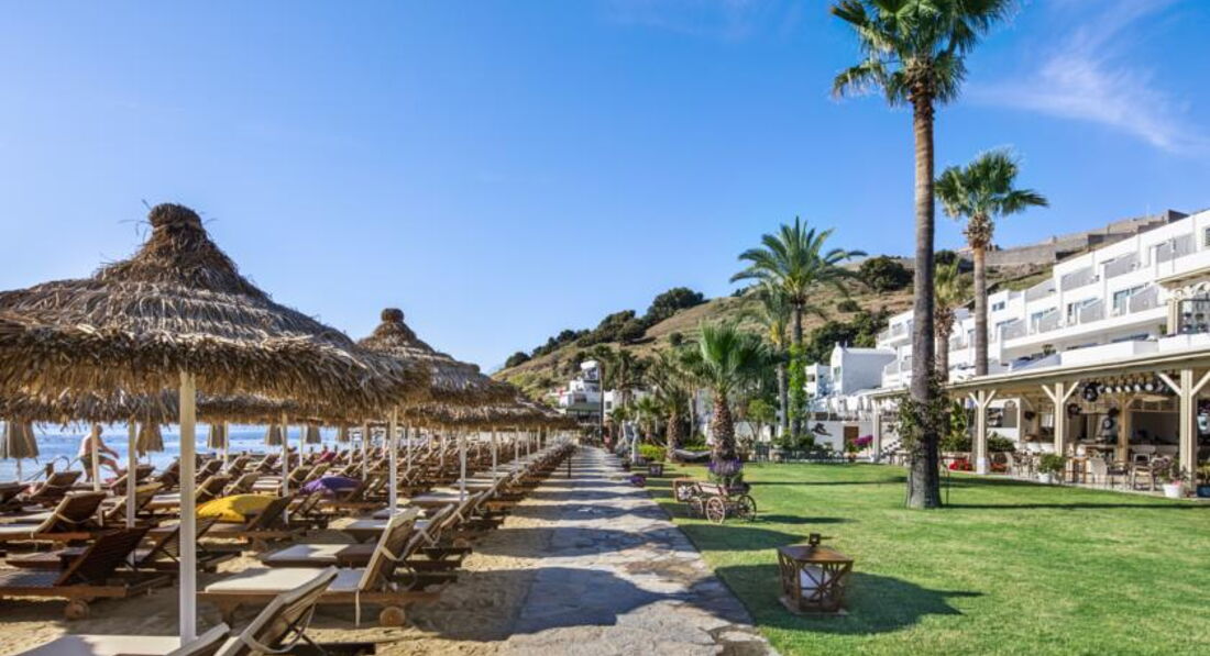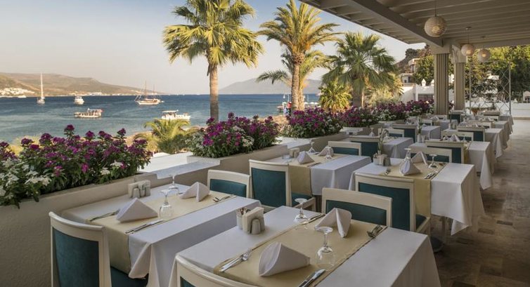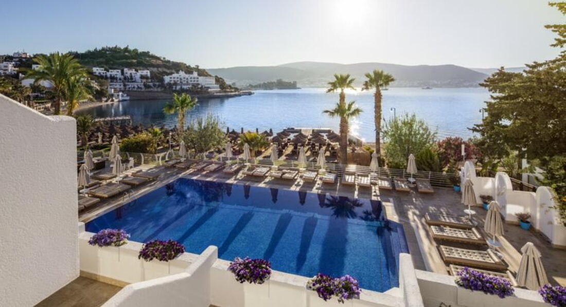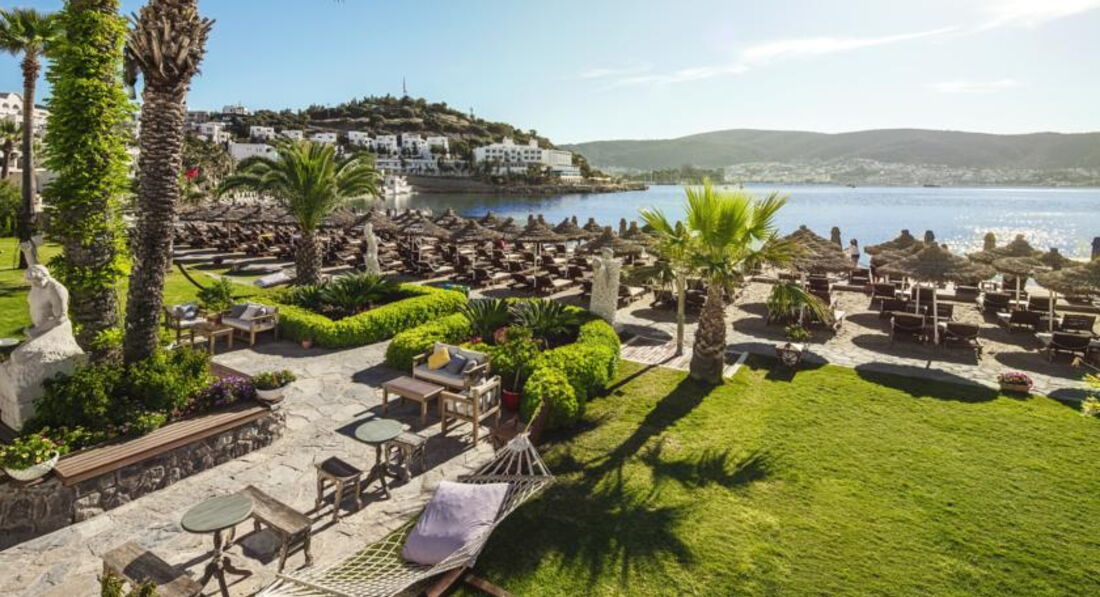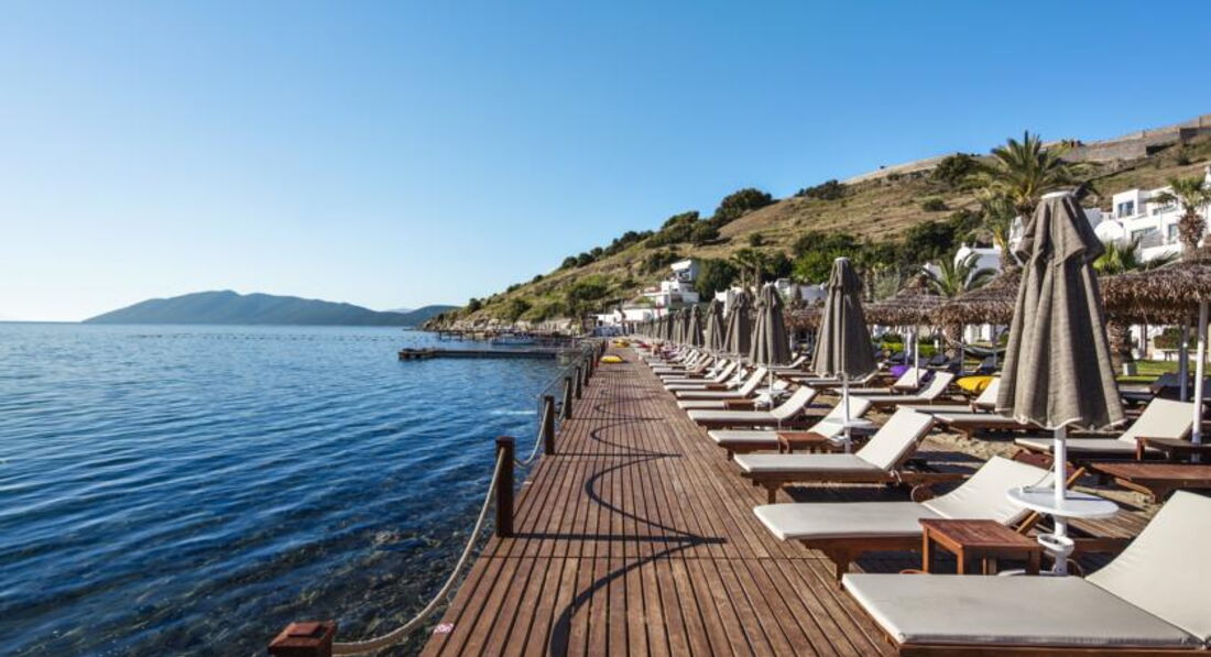Великолепный отель с компактной красивой территорией, отличным сервисом и превосходной кухней. Очень вежливый и дружелюбный персонал. Комфортный пляж с ночной подсветкой пирса и великолепным видом на Бодрум. Всего пару раз выбирались на водном такси в Бодрум, стоянка рядом с отелем, лодки ходят часто, очень удобно. Ландшафтный дизайн - выше всяческих похвал, очень много зелени и цветов, радует глаз на каждом шагу. Качественная ежедневная уборка, все туалетные принадлежности приносили каждый день, мини-бар пополнялся также каждый день. Номер чистый, кажется, что новый, всё удобно и красиво (хотя брали самый дешевый). Приятная шоу-программа каждый день, смотрели с удовольствием. Пару раз поиграли в настольный теннис. Ну и, конечно же, нельзя не отметить превосходную кухню в этом отеле - это что-то!!! Все вкусно, разнообразно и красиво подано в большом количестве. Изобилие морепродуктов, рыбы, сыров, сладостей (объедались пахлавой). Даже роллы были. Можно долго перечислять А-ля карт - высший класс! Пожалуй, это - лучший отель в нашем списке!