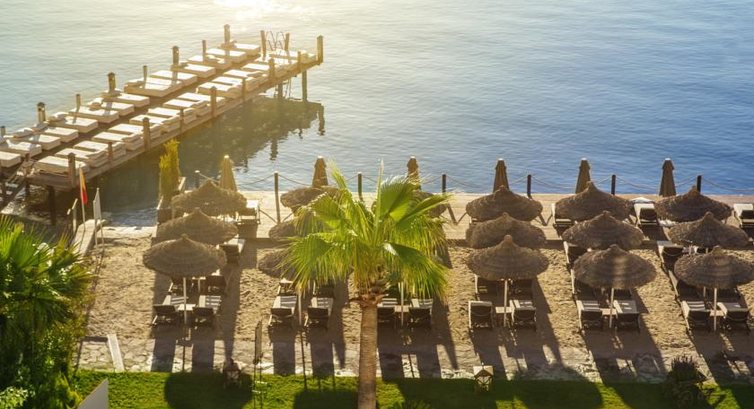 Огромный плюс+++++++++Вид с пляжа на крепость Бодрума-визитная карточка города. Необыкновенно красиво! Море чистейшее. Глубина начинается в метрах 100 от берега! Лежаки стоят на песке, а вот спуск в море по каменным ступенькам или с помощью небольшого понтона. Все удобно=)