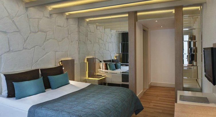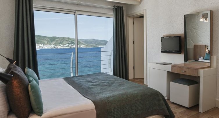 Номера небольшие, светлые, современная мебель, тв плазма.Из окон открывается вид на Бодрум.